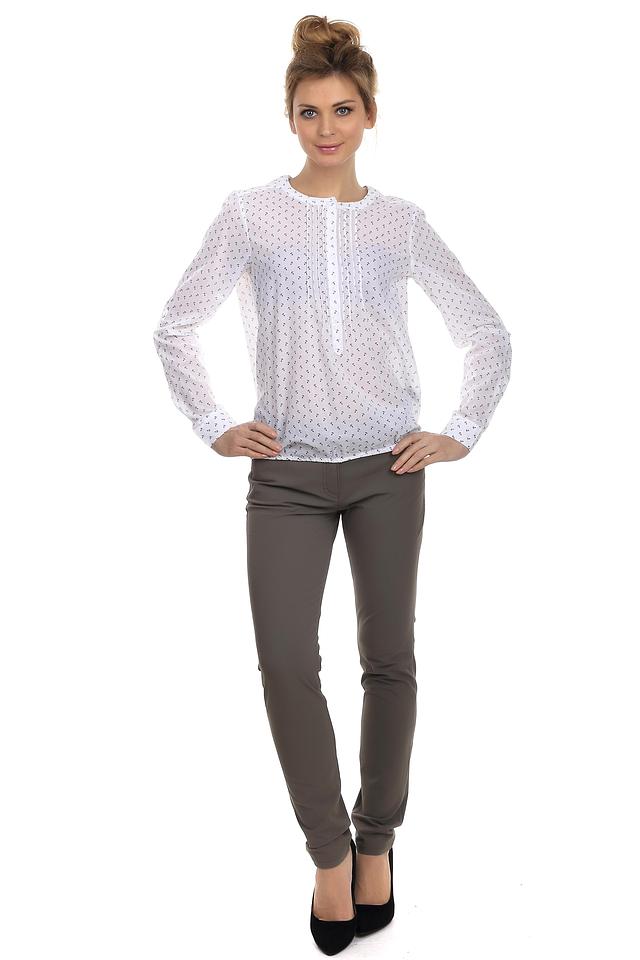 Модель имеет длинные рукава и круглый вырез горловины. Передняя часть блузы украшена декоративной сборкой, создающей лёгкую драпировку. Застёжка выполнена на пуговицы в тон ткани.