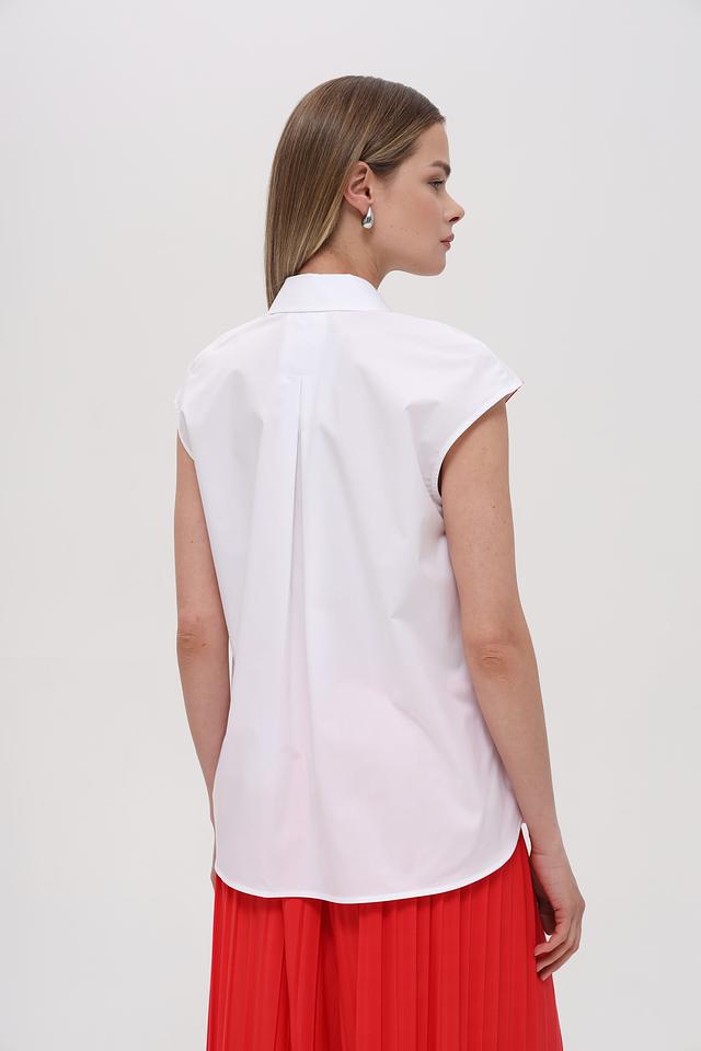 Основной цвет блузы – белый, однако центральная часть украшена крупным цветочным принтом в красных тонах. Такое сочетание делает блузу универсальной и подходящей для различных случаев – от повседневной носки до особых мероприятий. Задняя часть блузы выполнена из однотонного белого хлопка.