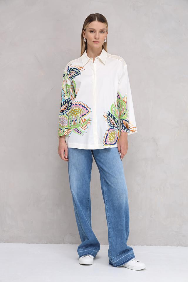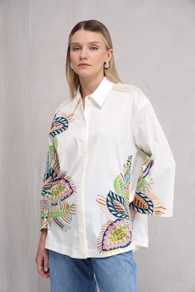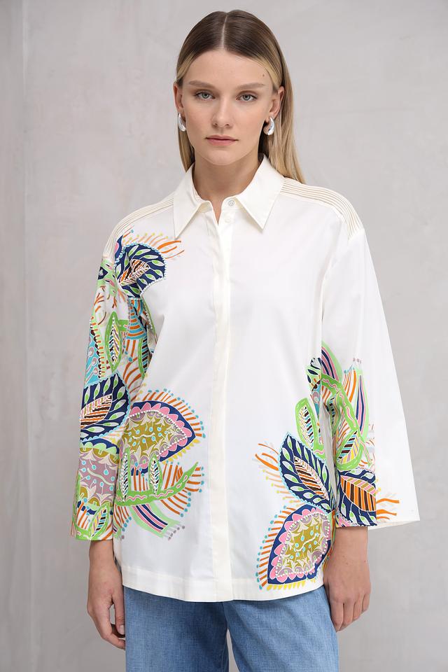 Блуза имеет классический крой с отложным воротником и застежкой на пуговицы. Рукава 3/4 с небольшими складками у плеч добавляют образу легкости и воздушности. Модель выполнена из высококачественного хлопка с добавлением эластана, что обеспечивает комфорт и свободу движений.