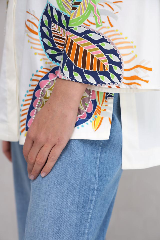 Эта блуза от Marc Cain – идеальный выбор для создания яркого и запоминающегося образа. Выполнена в белом цвете и украшена красочным цветочным принтом, который придает ей неповторимый шарм.