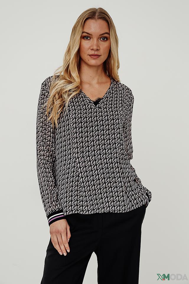 Блуза имеет свободный крой и V-образный вырез горловины. Её украшает стильный геометрический принт в чёрно-белой гамме, который придаёт ей изысканность и современный вид. Длинные рукава дополнены манжетами с контрастной полоской.