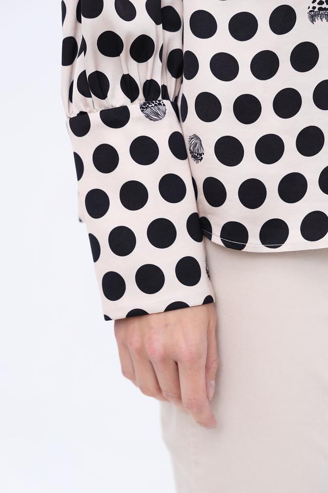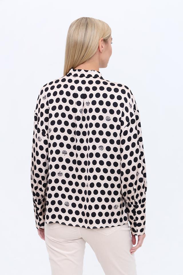 Эта блуза от Marc Cain Collections выполнена из высококачественной вискозы, что делает её приятной к телу и комфортной в носке. Преобладающий цвет – слоновая кость, а рисунок – классический чёрный горошек, создающий элегантный и женственный образ.