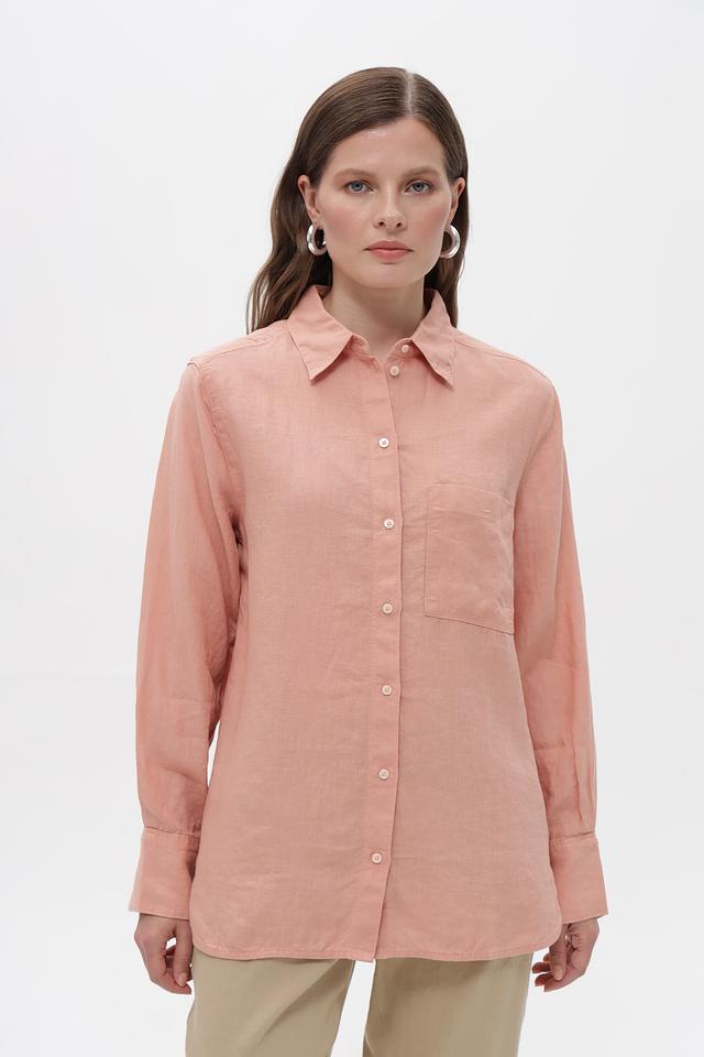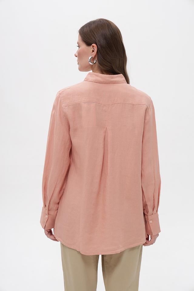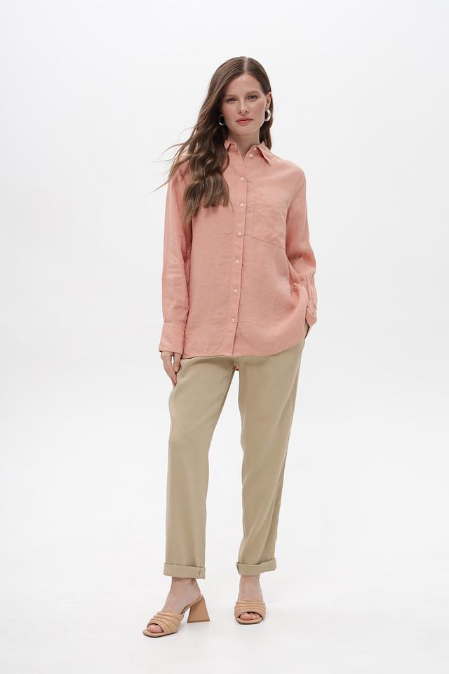 Рукава блузы длинные, с манжетами на пуговицах, что позволяет регулировать их длину. Цвет блузы – нежный персиковый, который освежает образ и подходит к различным цветовым сочетаниям. Эта блуза станет отличным дополнением к вашему гардеробу и позволит создавать стильные и комфортные образы на каждый день.