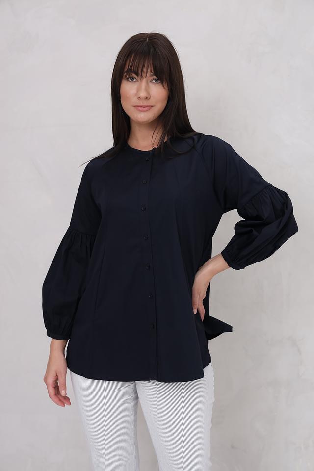Особенностью данной модели являются объемные рукава-фонарики, которые придают блузе романтичный и женственный вид. Застежка на пуговицы по всей длине позволяет регулировать степень прилегания и создавать разные силуэты.