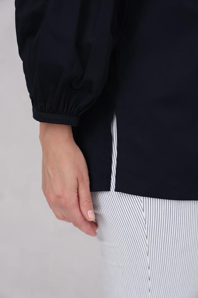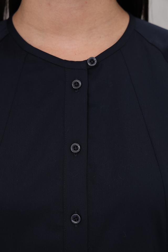 Воротник рубашечного типа добавляет блузе классический и элегантный вид. Темно-синий цвет делает ее универсальной и подходящей для различных случаев.