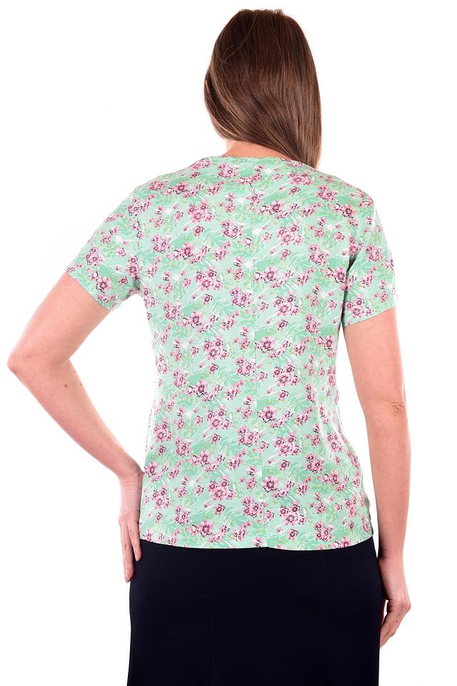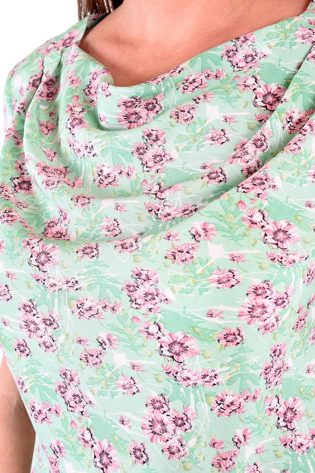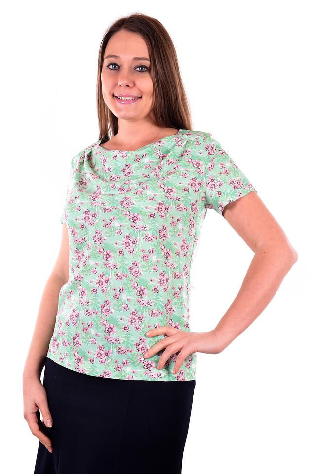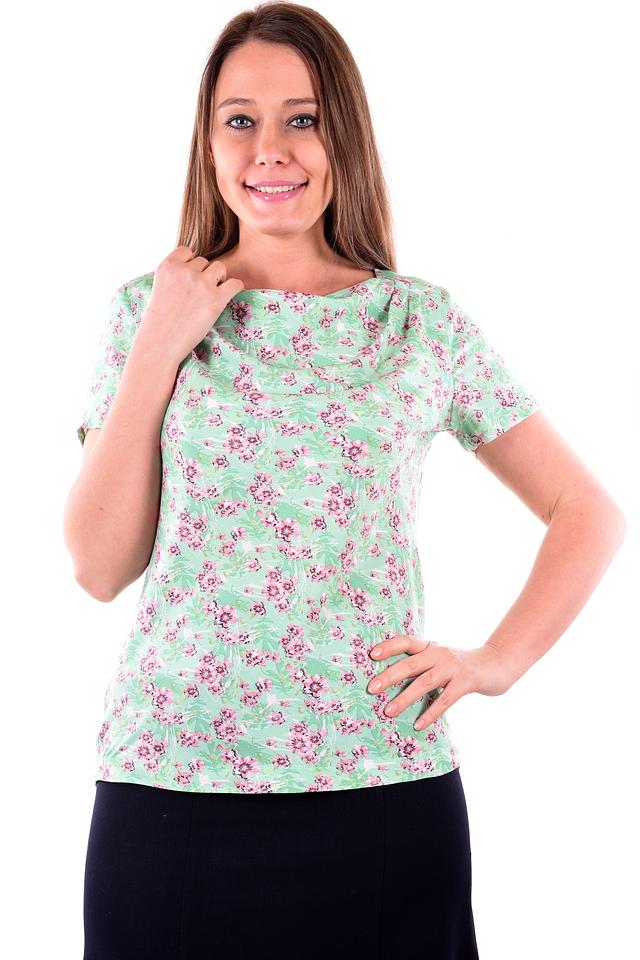 Блуза имеет лёгкий, струящийся силуэт и короткие рукава. Основной цвет блузы – светло-зелёный, который украшен мелким цветочным принтом в розовых и белых тонах. Особенностью модели является драпированный воротник, придающий ей элегантность и изысканность.