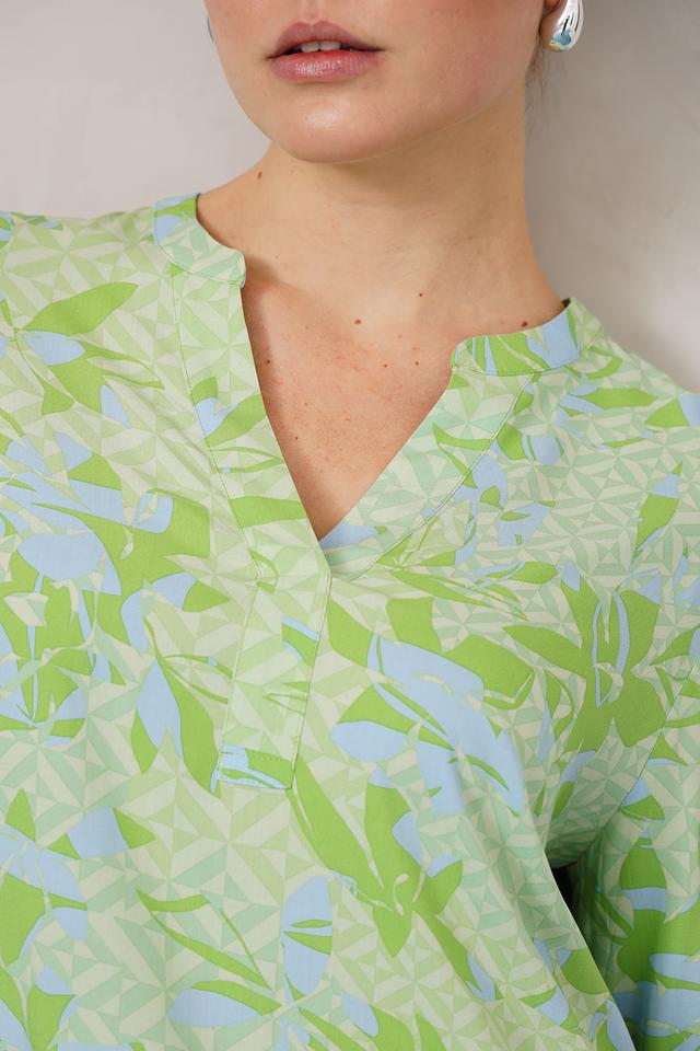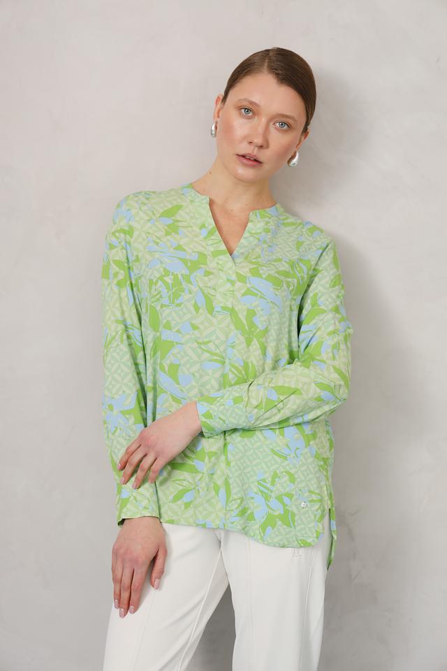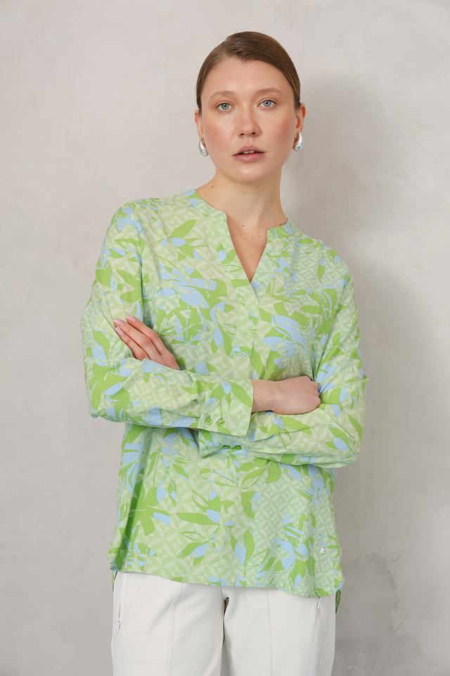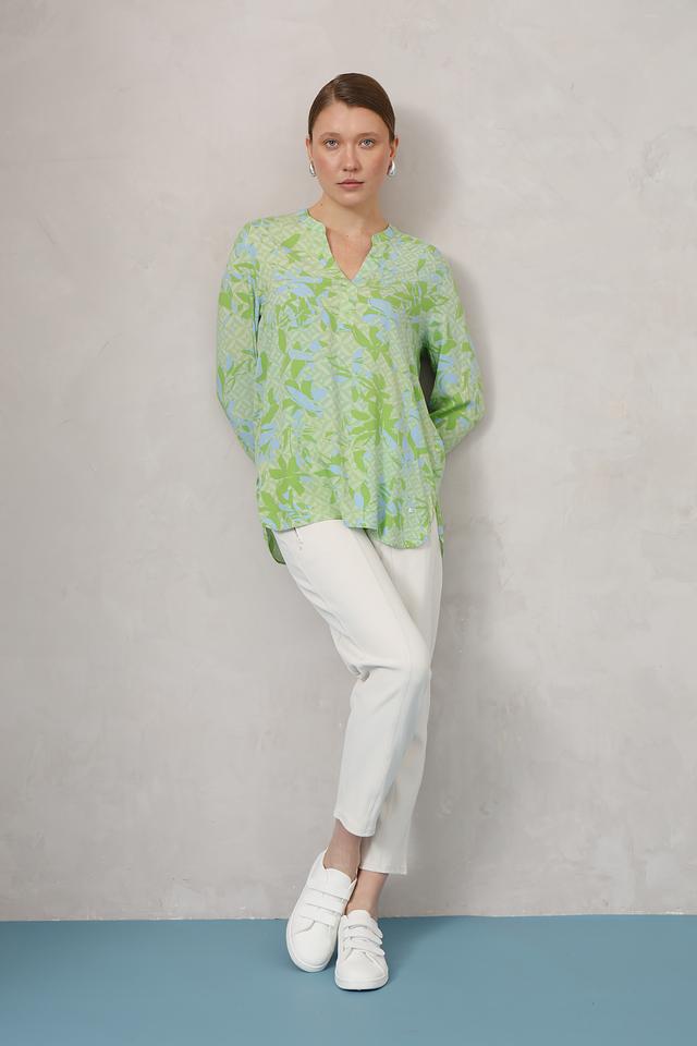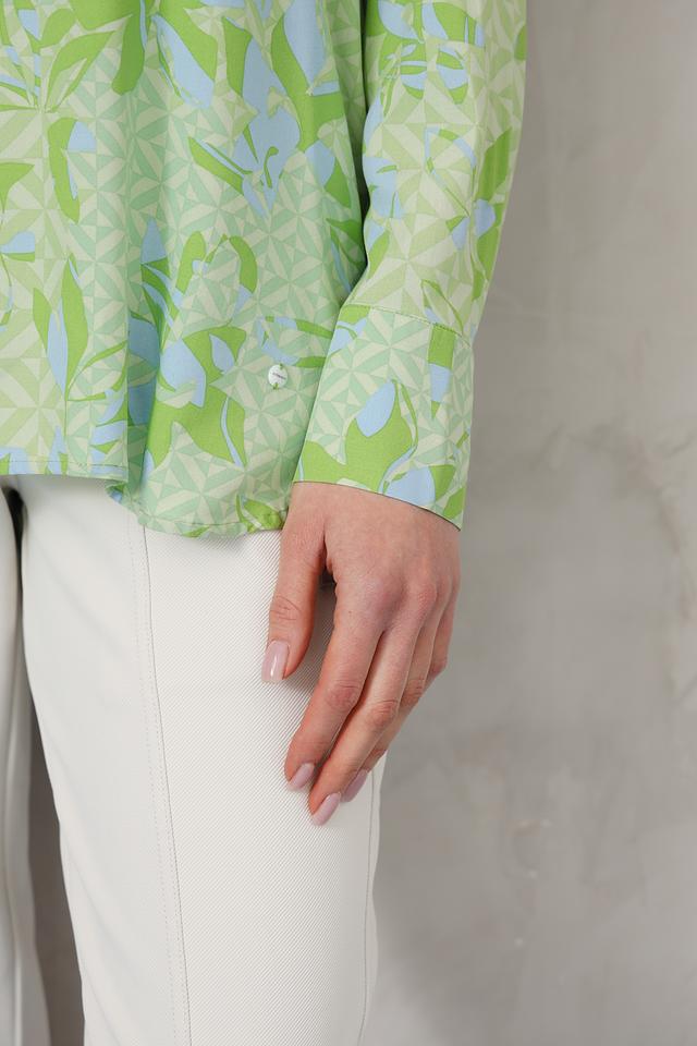 Особенностью данной модели является яркий и оригинальный принт с изображением листьев и цветов в зеленых и голубых тонах. V-образный вырез горловины и длинные рукава с манжетами придают блузе элегантный и женственный вид.
