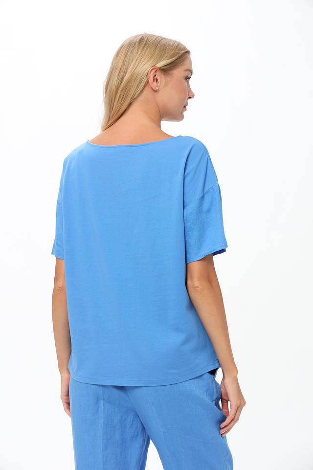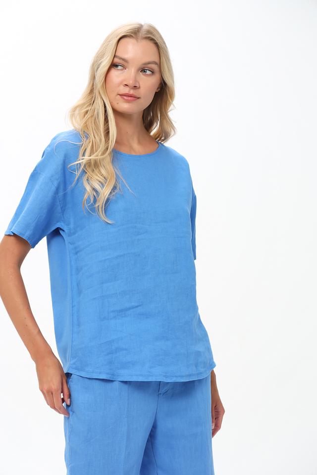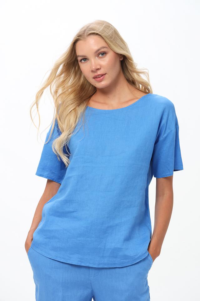 Блуза имеет прямой, слегка свободный крой, который не сковывает движения и позволяет коже дышать. Короткие рукава и округлый вырез горловины придают ей непринуждённый и лёгкий вид. Блуза идеально подходит для создания повседневных образов.