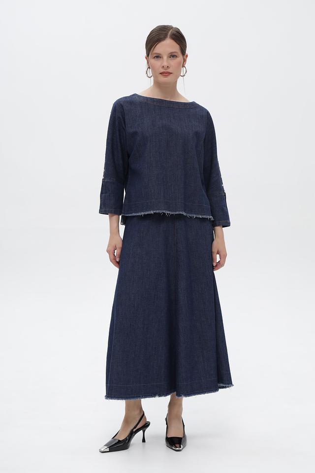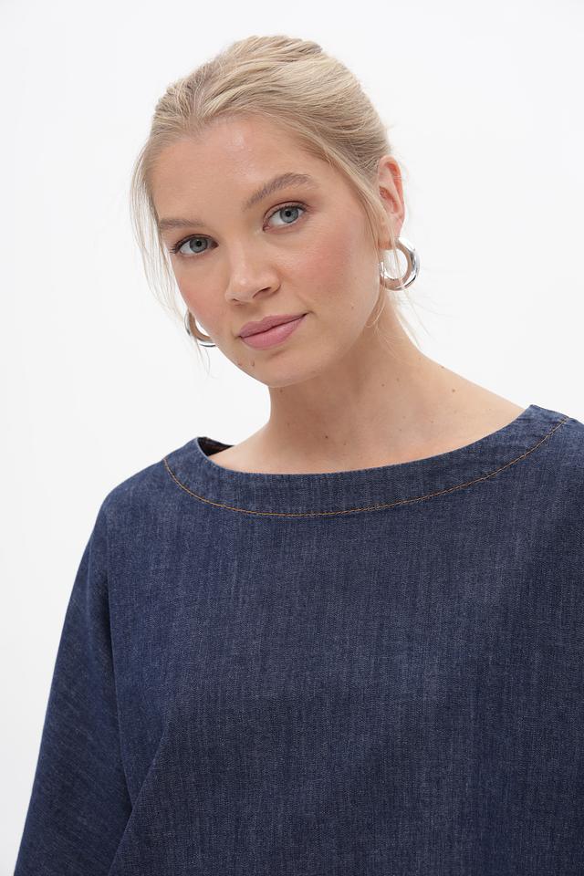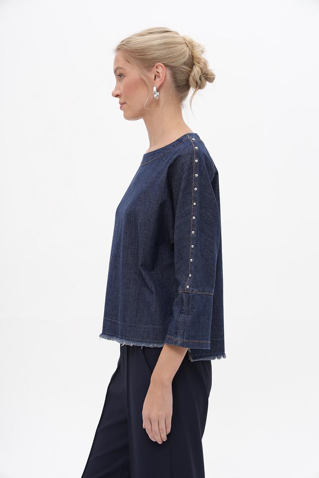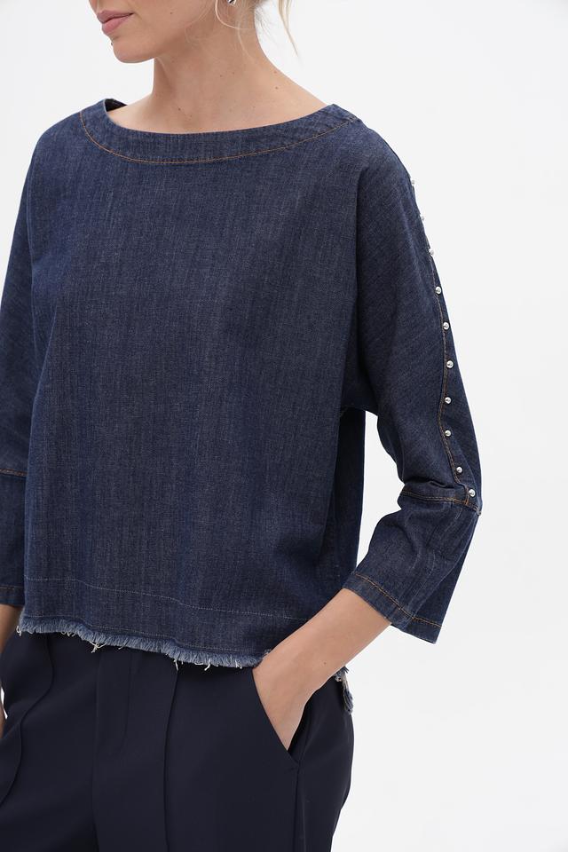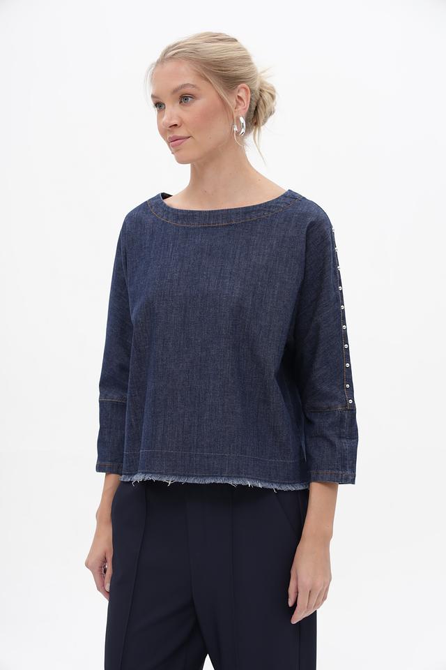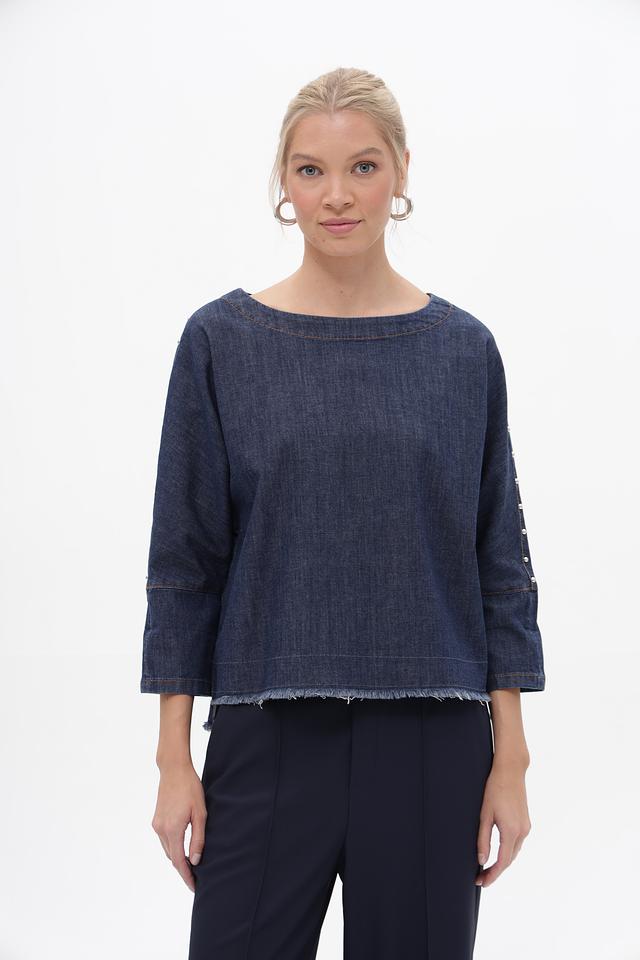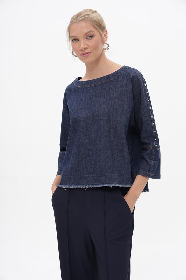Блуза Oui из денима синего цвета – стильная и удобная модель с рукавами 3/4 и необработанным краем. Изготовлена из хлопка с добавлением эластана для комфорта и свободы движений. Состав: хлопок 98%, эластан 2%