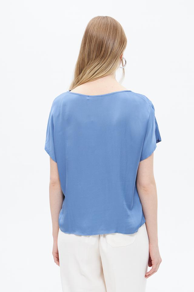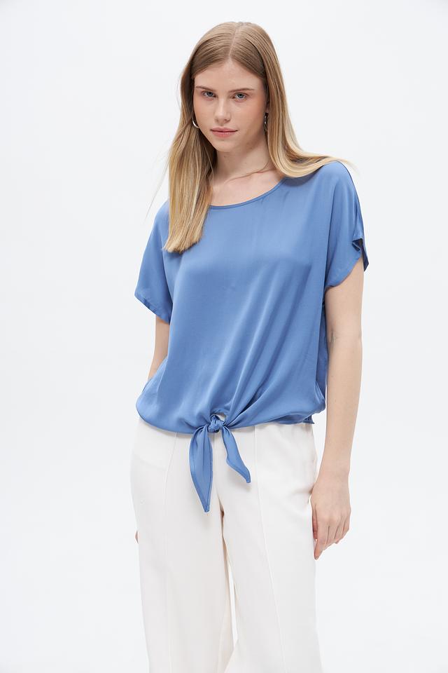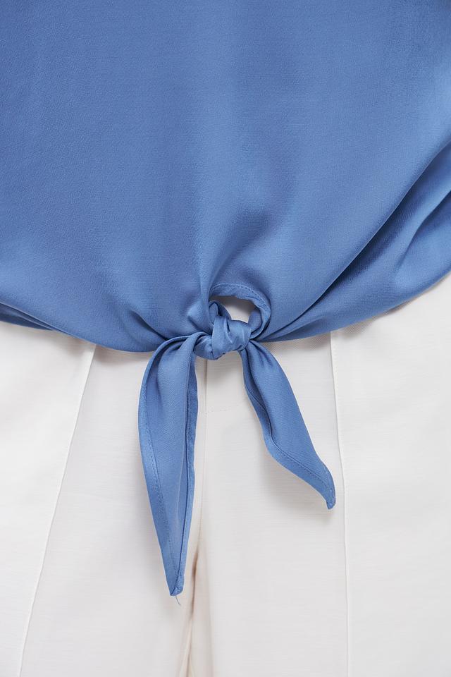 Модель имеет короткие рукава и округлый вырез горловины. Особенностью блузы является завязка на талии, которая позволяет подчеркнуть фигуру и создать более женственный силуэт.
