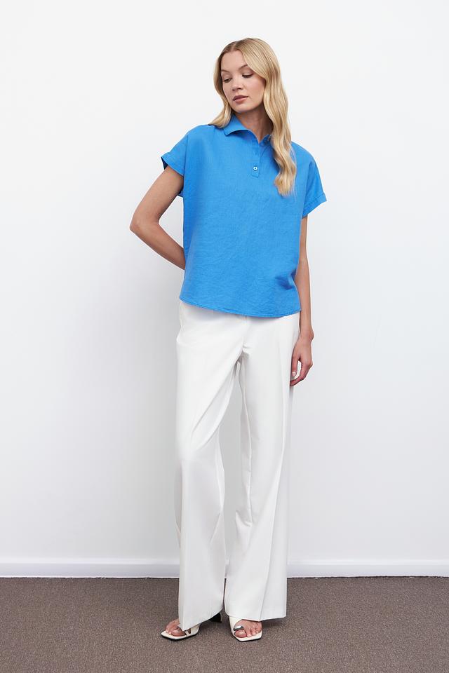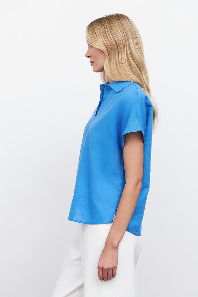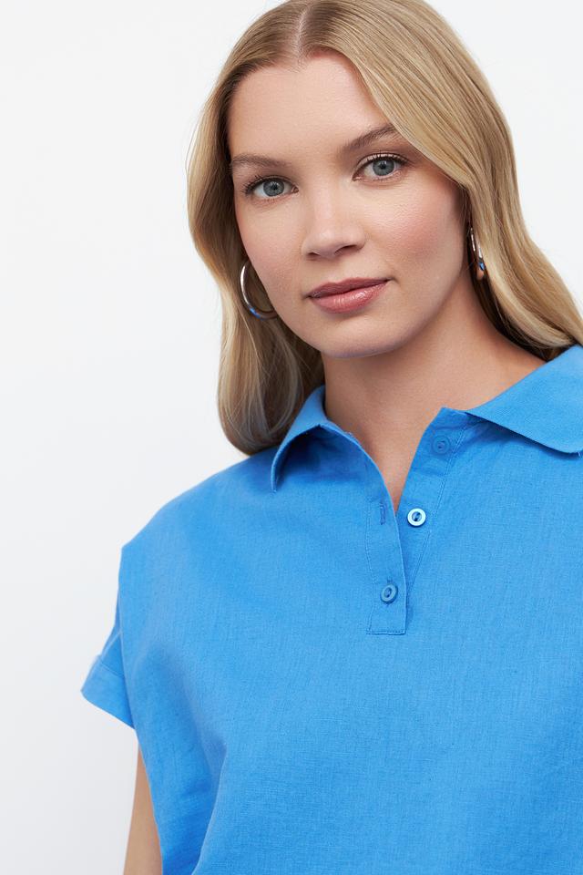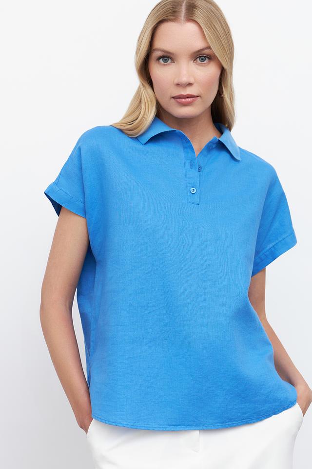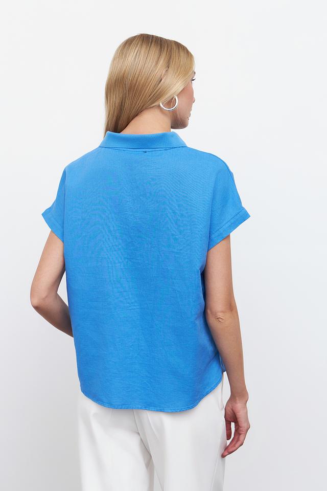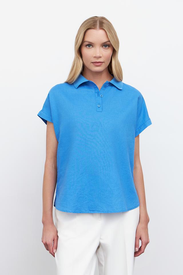 Голубая блуза Pezzo с короткими рукавами и воротником-поло станет отличным дополнением к вашему гардеробу. Изготовлена из натурального льна и хлопка, обеспечивая комфорт и воздухопроницаемость. Состав: лен 55%, хлопок 45%