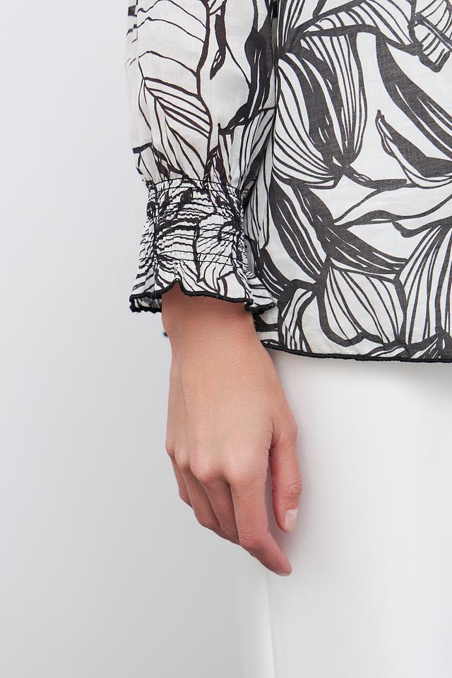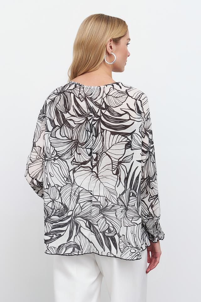 Блуза Pezzo чёрно-белого цвета с оригинальным принтом в виде листьев станет стильным дополнением к вашему гардеробу. Модель выполнена из 100% хлопка, что обеспечивает комфорт в носке. Состав: хлопок 100%