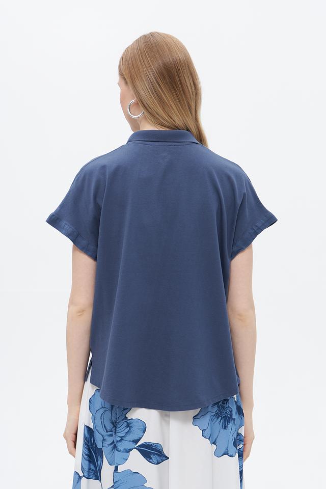 Блуза имеет прямой крой, который обеспечивает комфортную посадку по фигуре. Воротник-поло придает модели классический вид, а короткие рукава делают ее идеальной для летних дней. Застежка на пуговицы добавляет функциональности и позволяет регулировать степень прилегания.