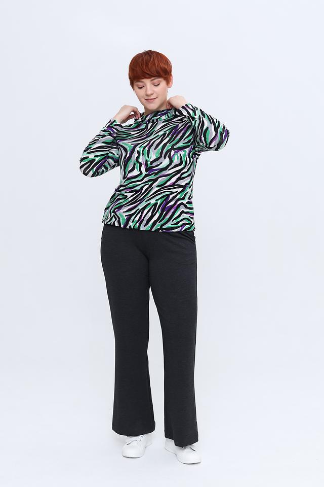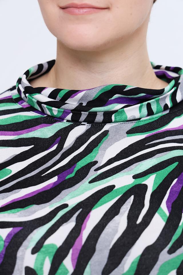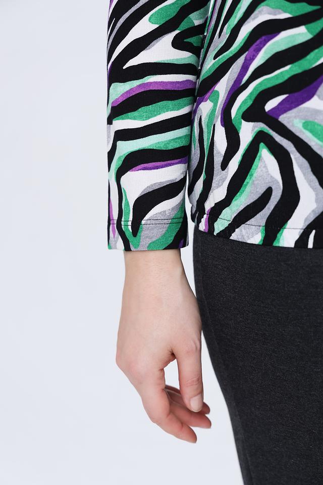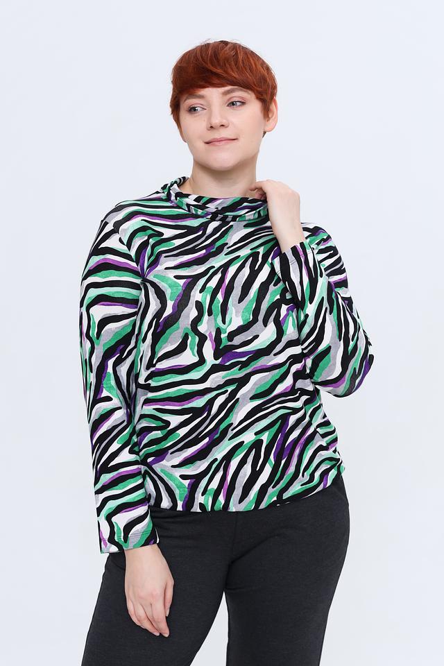 Эта блуза от Rabe collection – отличный выбор для тех, кто ценит оригинальный стиль и комфорт. Блуза выполнена в ярких зеленых, фиолетовых и серых тонах с эффектным принтом, имитирующим окрас зебры.