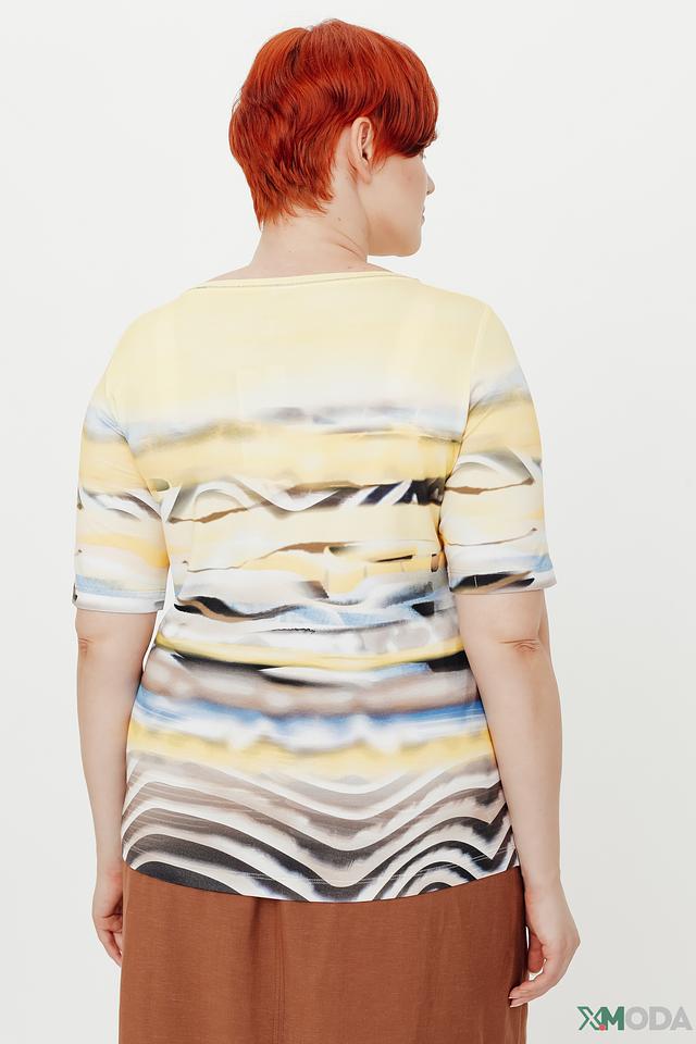Модель имеет свободный крой, который обеспечивает комфорт в носке. Короткие рукава делают блузу идеальным выбором для тёплой погоды. Вырез горловины – округлый, классический.