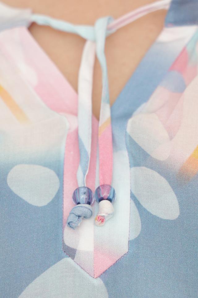 Особенностью данной модели является яркий и необычный принт, сочетающий в себе оттенки розового, голубого и жёлтого. V-образный вырез горловины дополнен завязками, которые позволяют регулировать глубину выреза и создавать различные силуэты.