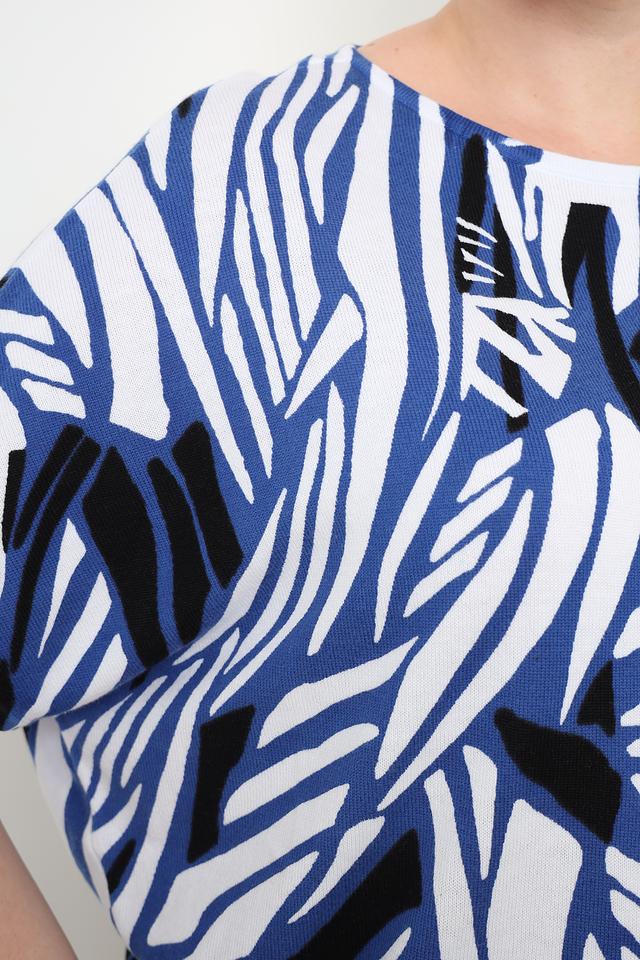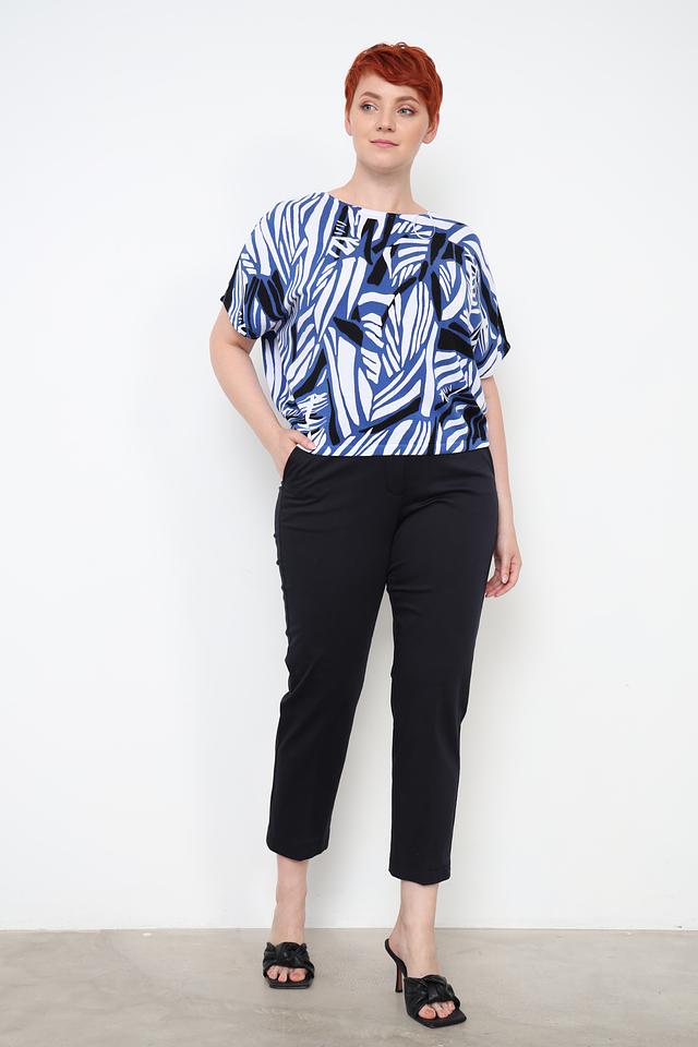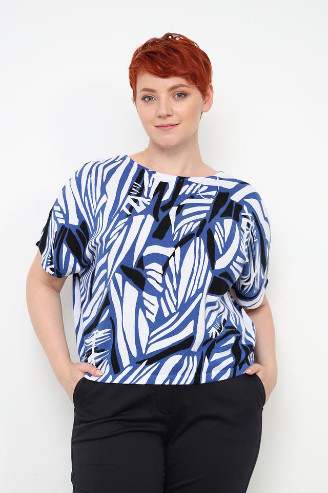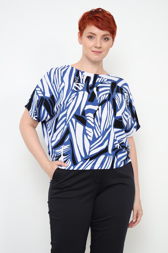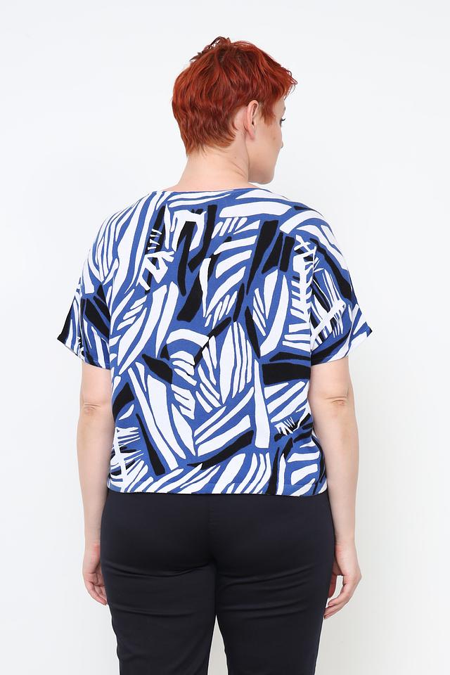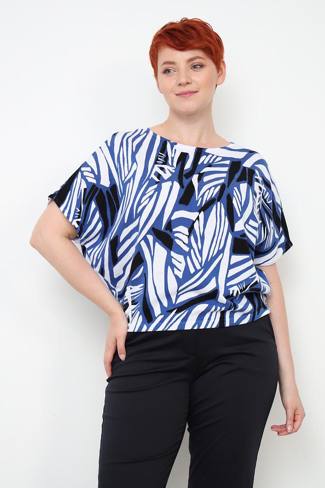 Блуза имеет свободный крой, который не сковывает движения и обеспечивает комфорт в течение всего дня. Короткие рукава делают ее отличным выбором для теплой погоды. Особенностью данной модели является яркий абстрактный принт, выполненный в синих, белых и черных тонах.
