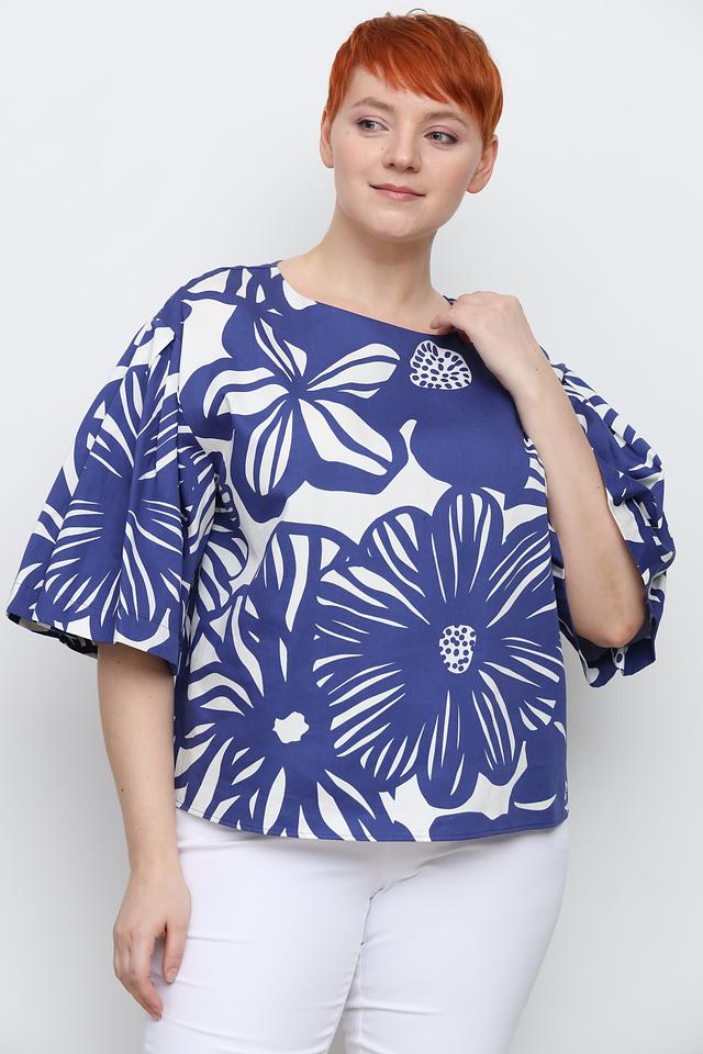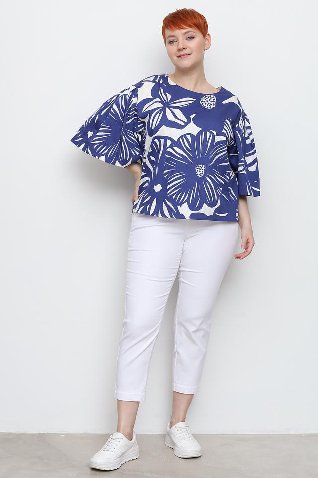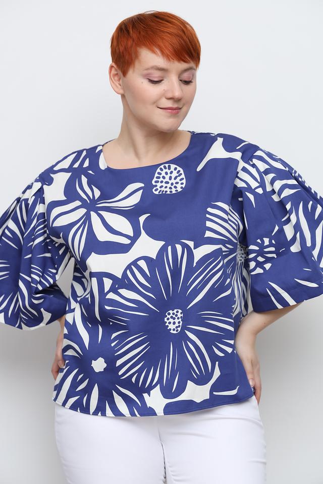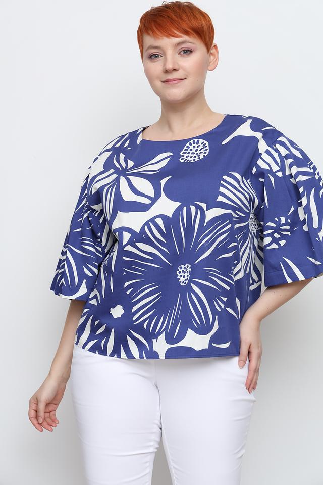 Блуза имеет свободный крой и короткие рукава с объемными манжетами, что придает ей легкость и воздушность. Основной цвет блузы – насыщенный синий, который служит прекрасным фоном для крупного белого цветочного принта.