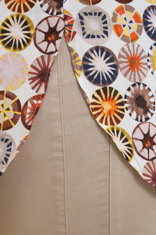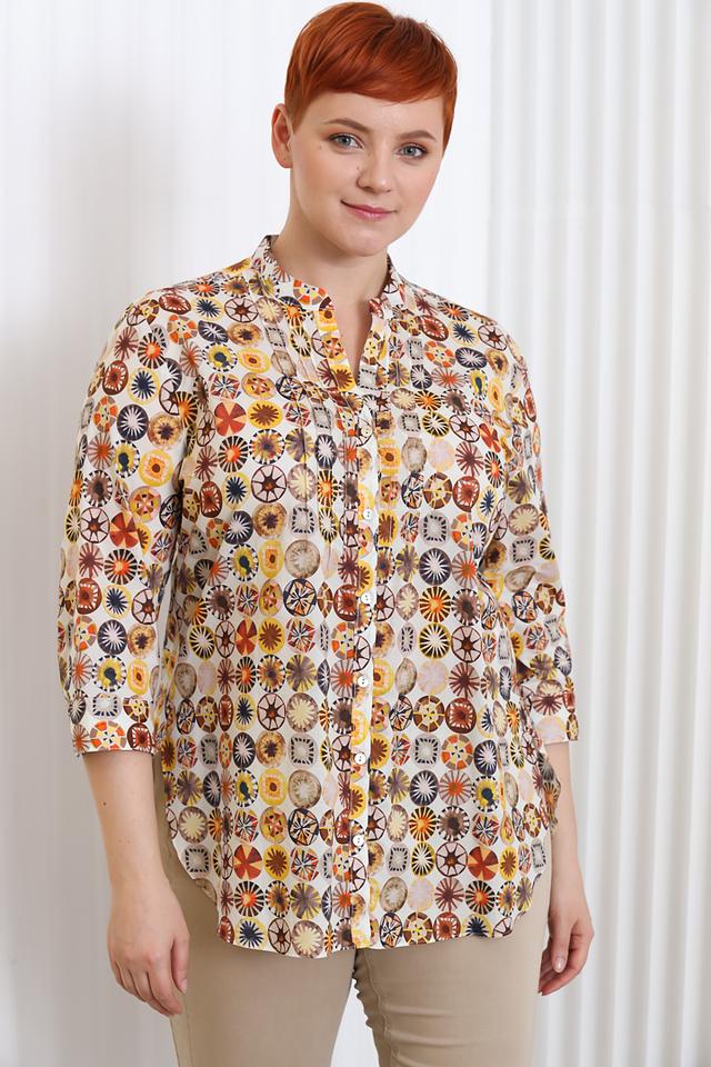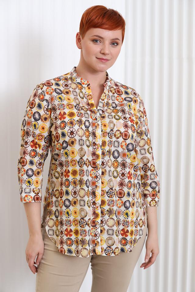 Особенностью данной модели является яркий и оригинальный цветочный принт, который состоит из множества разноцветных элементов. Принт выполнен в бежевой, коричневой, оранжевой и синей гамме, что делает блузу универсальной и подходящей для различных образов.