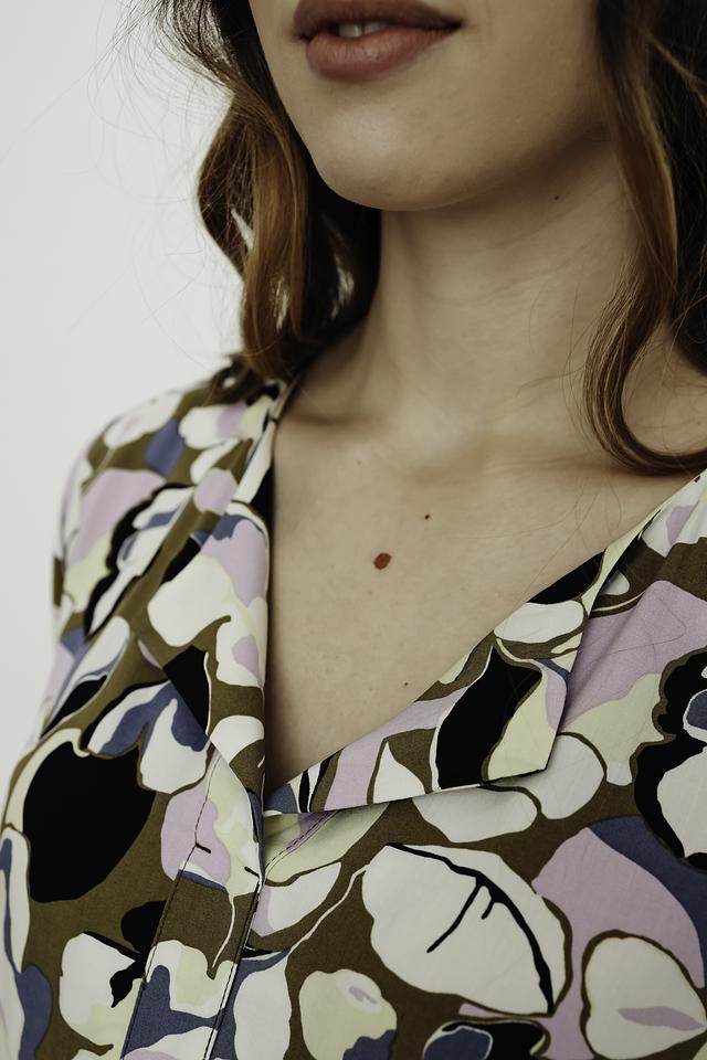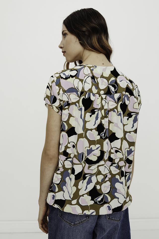 Блуза имеет оригинальный цветочный принт, сочетающий в себе оттенки оливкового, голубого, лавандового и чёрного. V-образный вырез горловины и короткие рукава придают модели лёгкость и женственность.