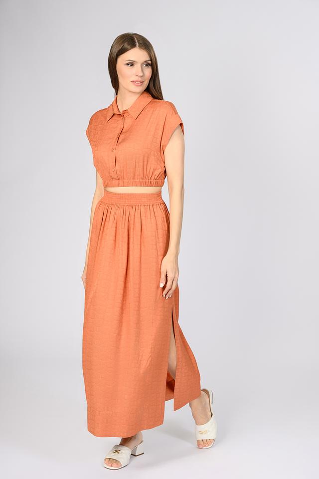 Оранжевая блуза Twin Set из 100% вискозы с укороченным кроем и оригинальным принтом в виде логотипа бренда. Модель с короткими рукавами и воротником-стойкой, застегивается на пуговицы. Состав: вискоза 100%