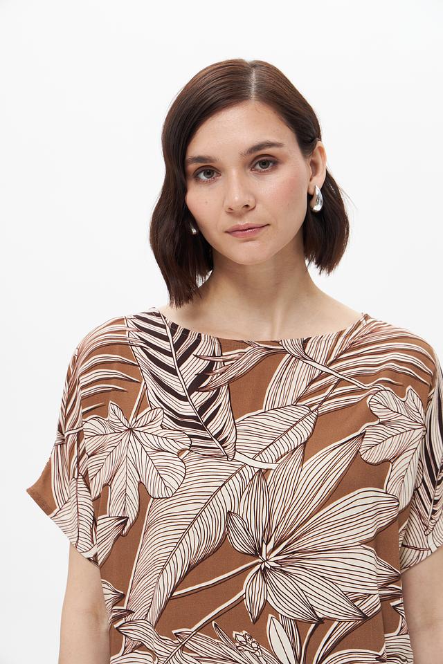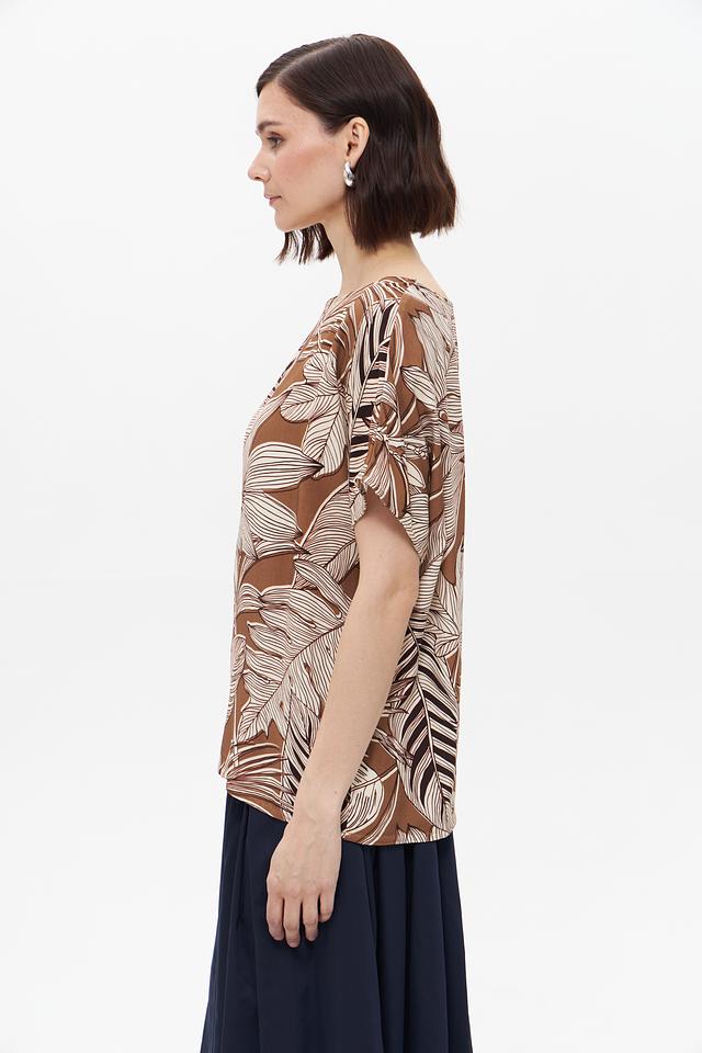 Эта блузка от UNQ станет отличным дополнением к вашему гардеробу. Модель выполнена в коричневом цвете и украшена стильным принтом в виде тропических листьев, выполненных в белых тонах.