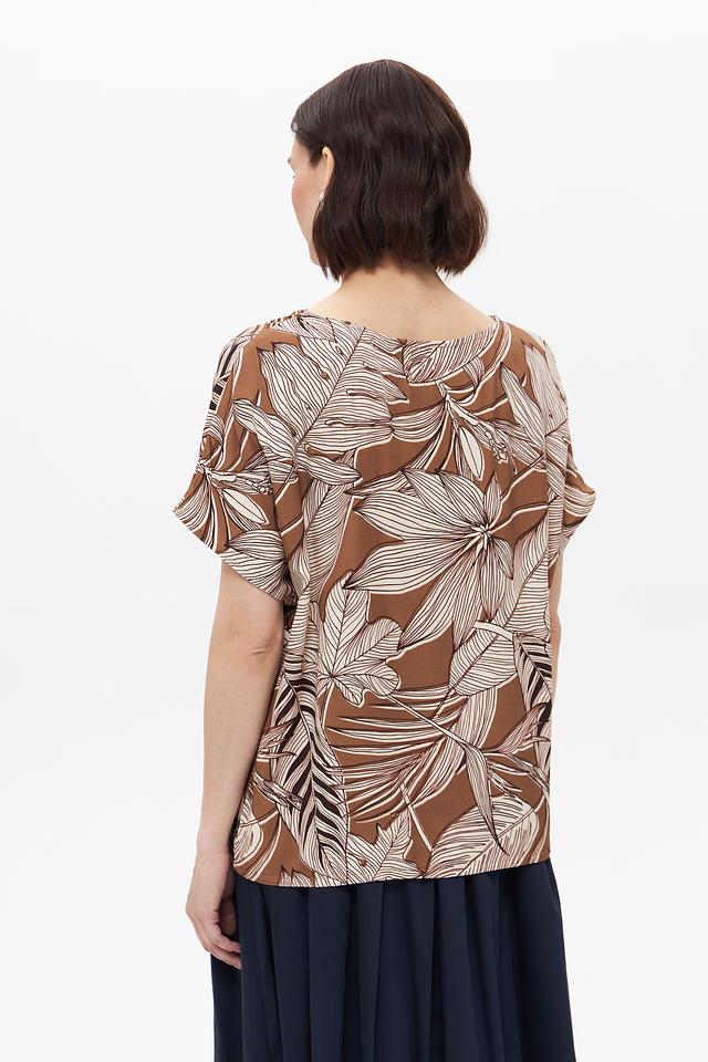 Женская блузка UNQ коричневого цвета с оригинальным принтом в виде листьев. Модель выполнена из 100% вискозы, обеспечивающей комфорт и приятные ощущения при носке. Состав: вискоза 100%