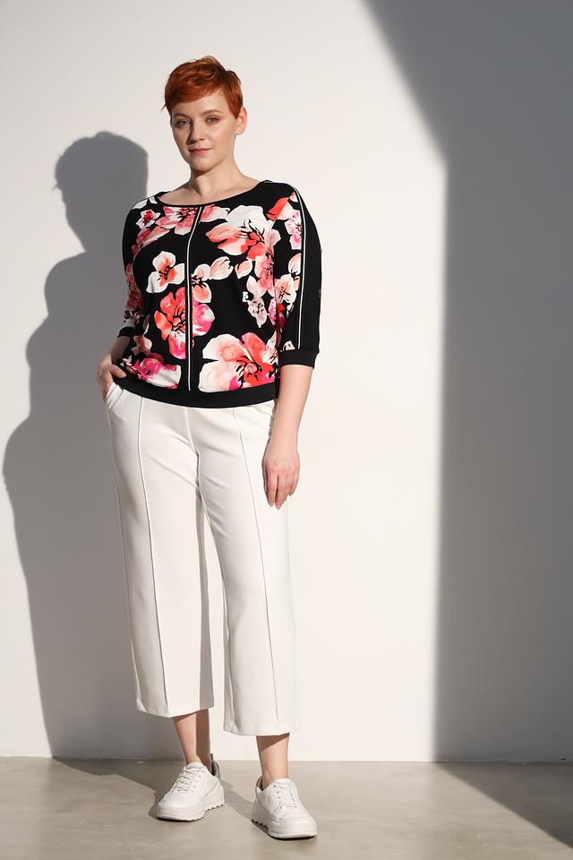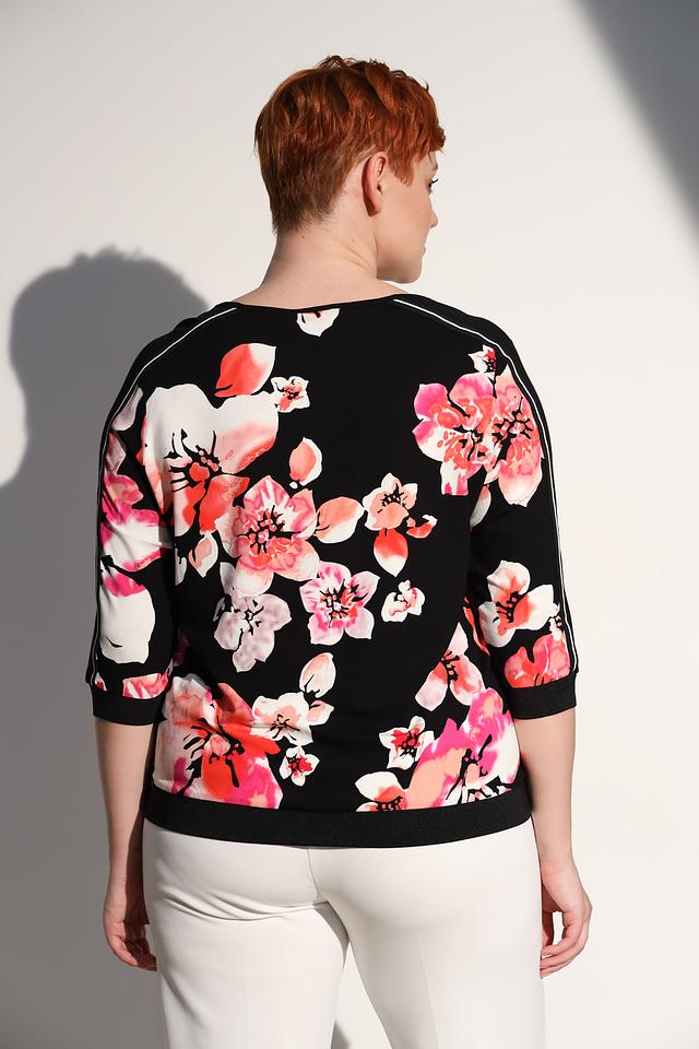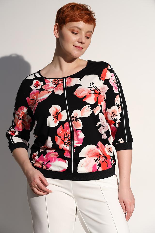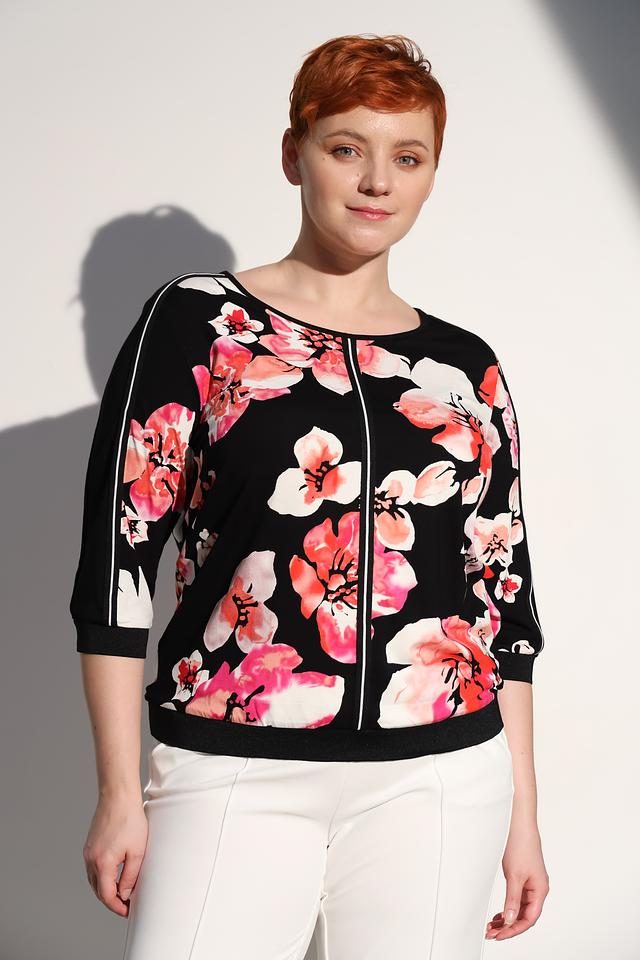 Основной цвет блузы – черный, который служит идеальным фоном для яркого цветочного принта. Принт выполнен в оттенках розового, красного и белого, создавая эффектный и запоминающийся образ.