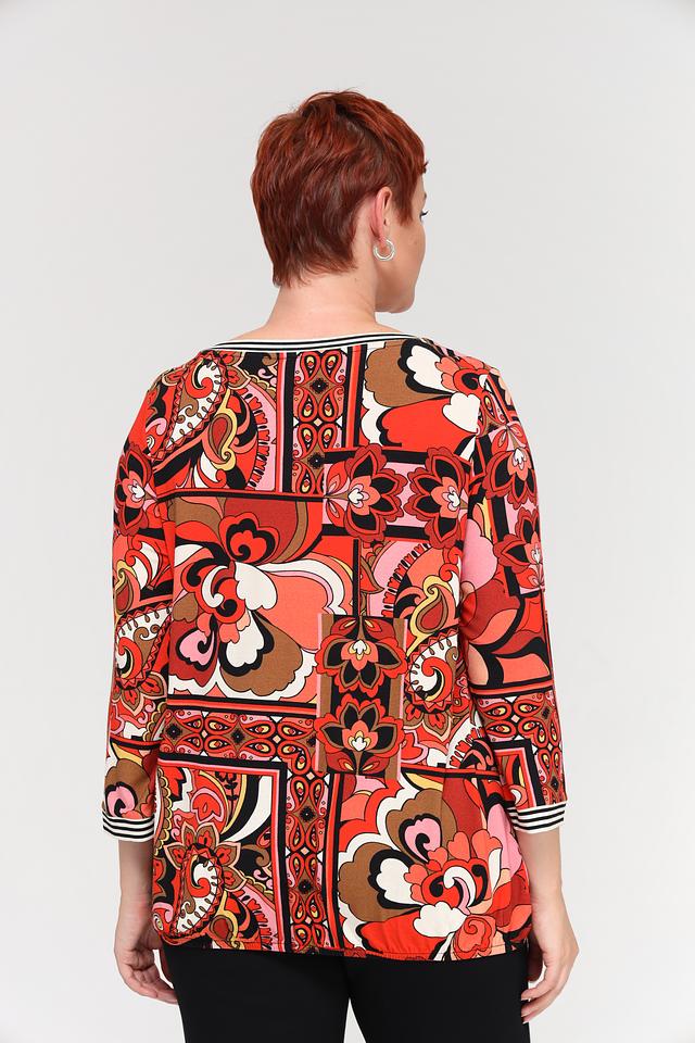Блуза имеет округлый вырез горловины и короткие рукава 3/4 с манжетами. Особенность модели – эффектный принт в этническом стиле, выполненный в насыщенных оттенках красного, коричневого и бежевого. Принт покрывает всю поверхность блузы, создавая динамичный и запоминающийся образ.