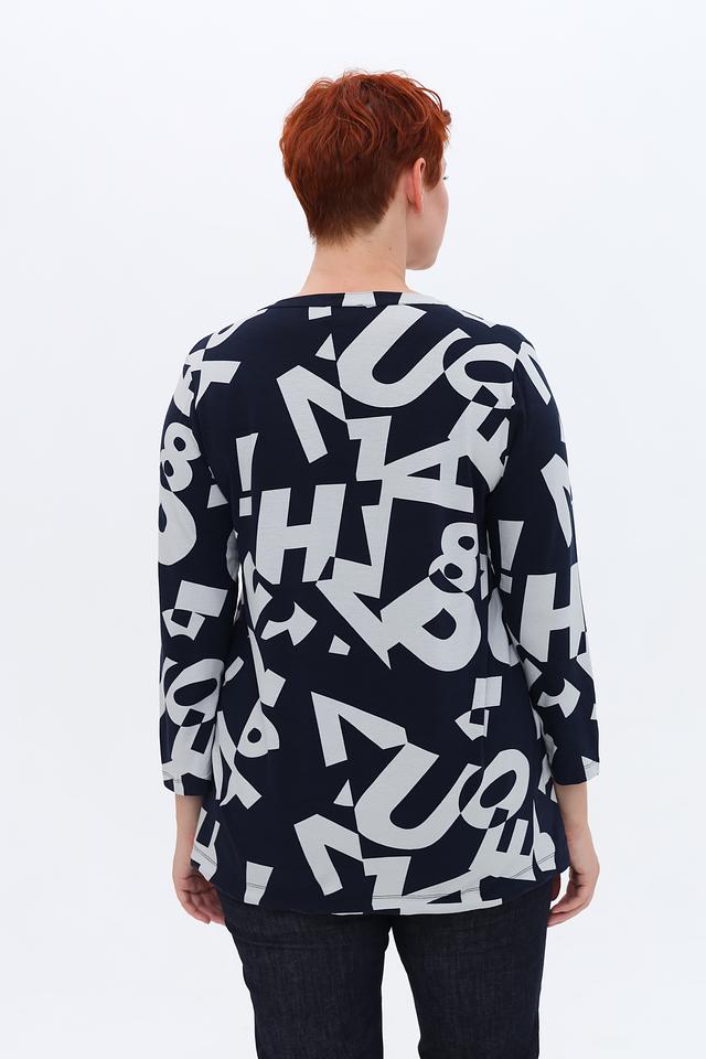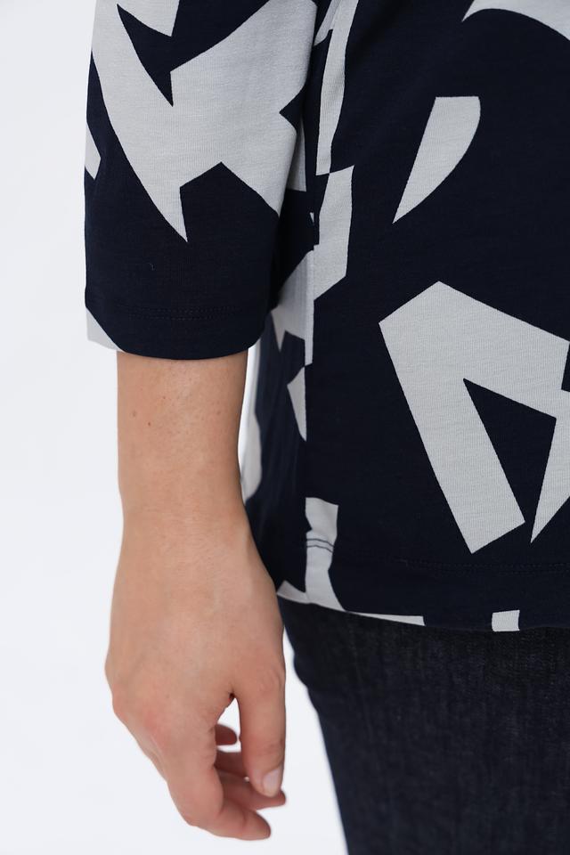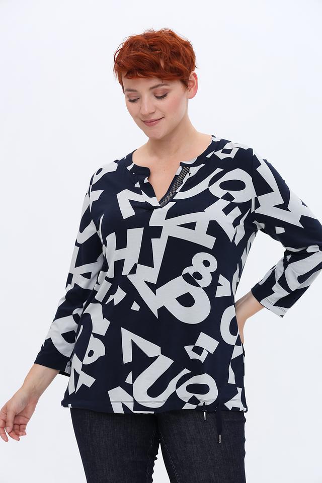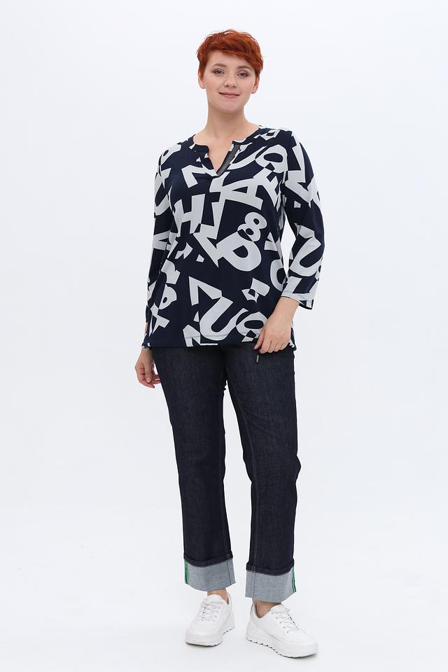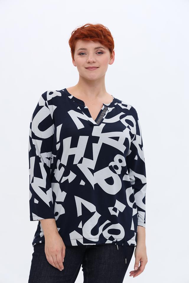Основной цвет блузы – темно-синий, а принт выполнен в светло-серых тонах, создавая контрастный и запоминающийся образ. V-образный вырез горловины украшен небольшим декоративным элементом. Рукава блузы – три четверти, что делает ее универсальной для любого времени года.