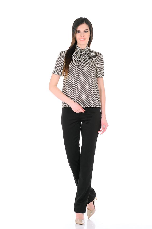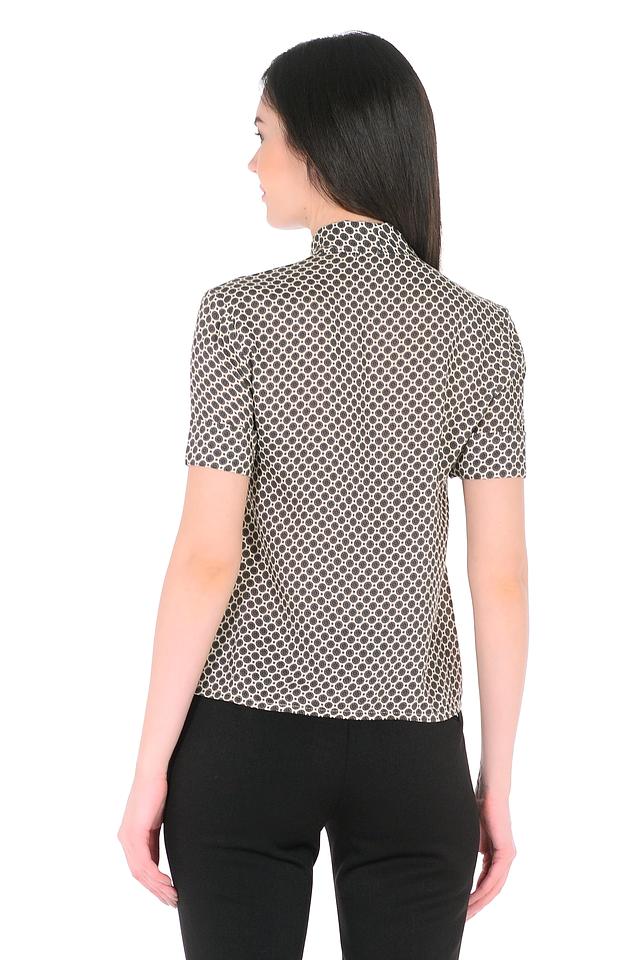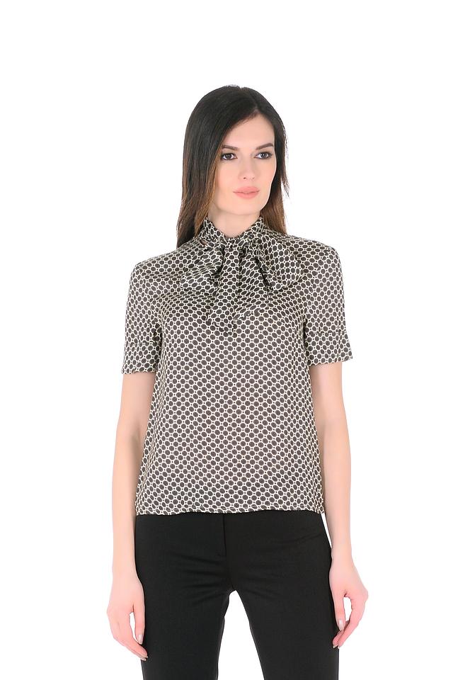 Блуза имеет короткие рукава и оригинальный воротник с завязками, которые можно повязать в виде изящного банта. Бежевый цвет с мелким геометрическим принтом в темных тонах делает эту модель универсальной и подходящей для различных случаев.