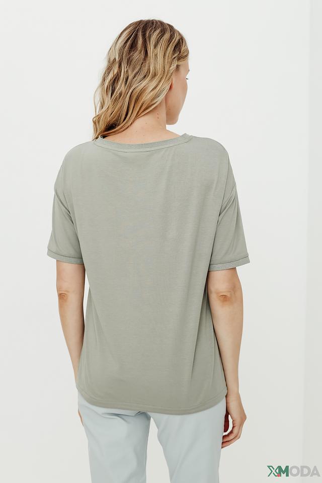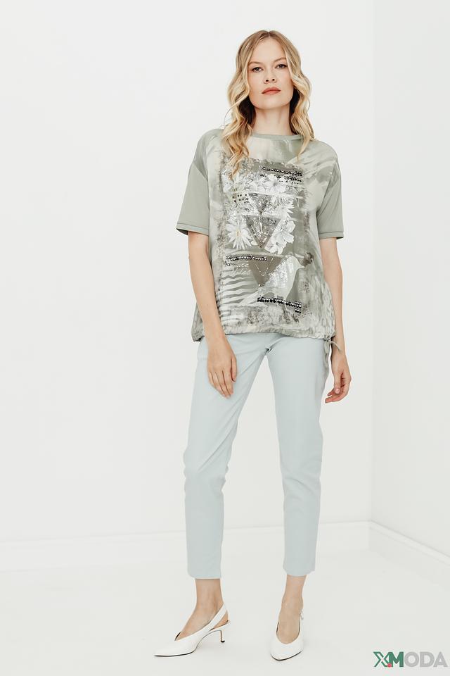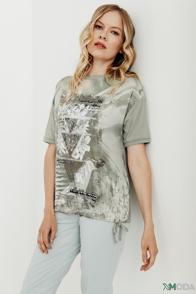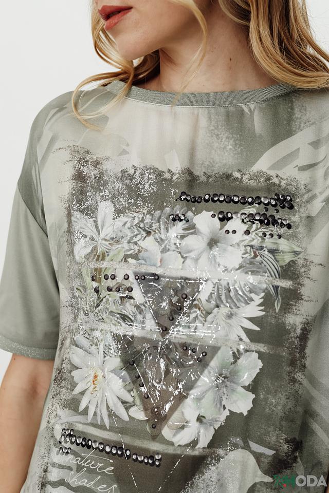 Стильная блуза Betty Barclay оливкового цвета с оригинальным цветочным принтом и декоративной отделкой пайетками. Модель свободного кроя с короткими рукавами и завязками по бокам. Состав: вискоза 92%, эластан 8%