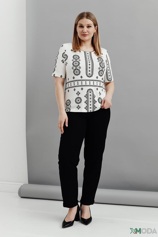 Блуза имеет прямой крой и короткие рукава, что делает её удобной и практичной. Изготовлена из высококачественной вискозы с добавлением эластана (93% вискоза, 7% эластан), благодаря чему она приятна к телу, хорошо драпируется и не мнется.