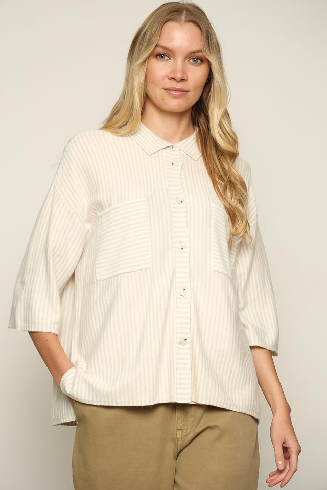 Бежевая рубашка от Oui с длинным рукавом и вертикальной полоской. Изготовлена из лёгкой ткани с добавлением вискозы, полиамида и шерсти, что обеспечивает комфорт и приятные тактильные ощущения. Отличный выбор для создания стильного повседневного образа. Состав: вискоза 45%, полиамид 40%, шерсть 15%