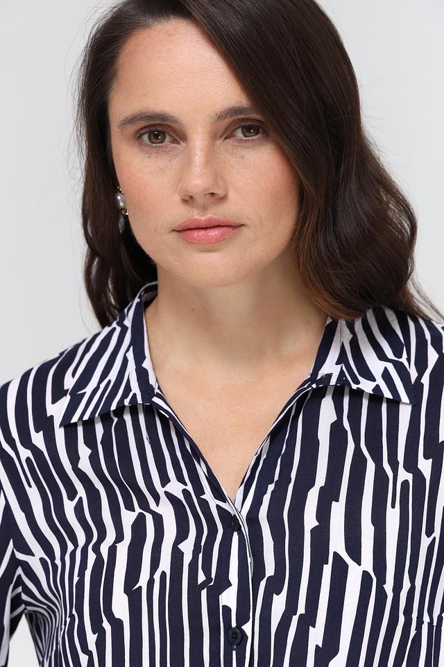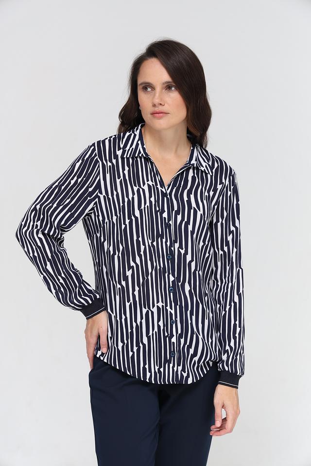 Блуза Rabe collection синего цвета с оригинальным полосатым принтом. Модель с длинными рукавами и классическим воротником, выполнена из мягкой и приятной к телу вискозы. Состав: вискоза 100%