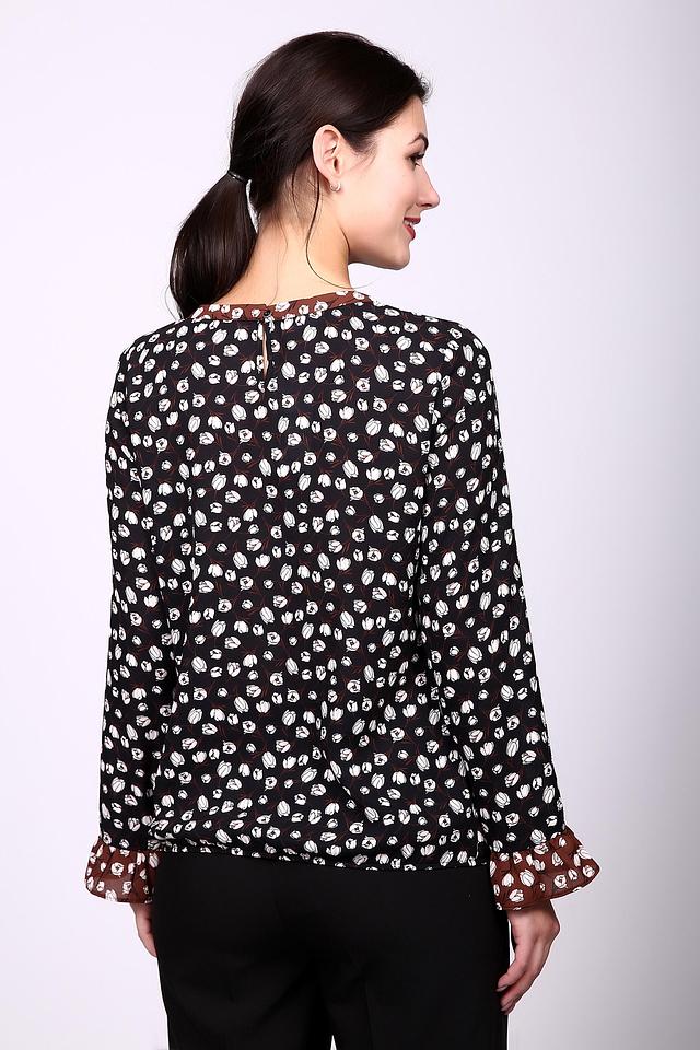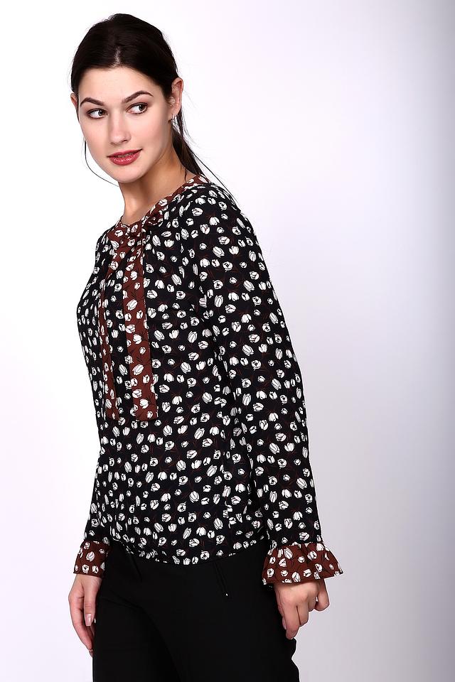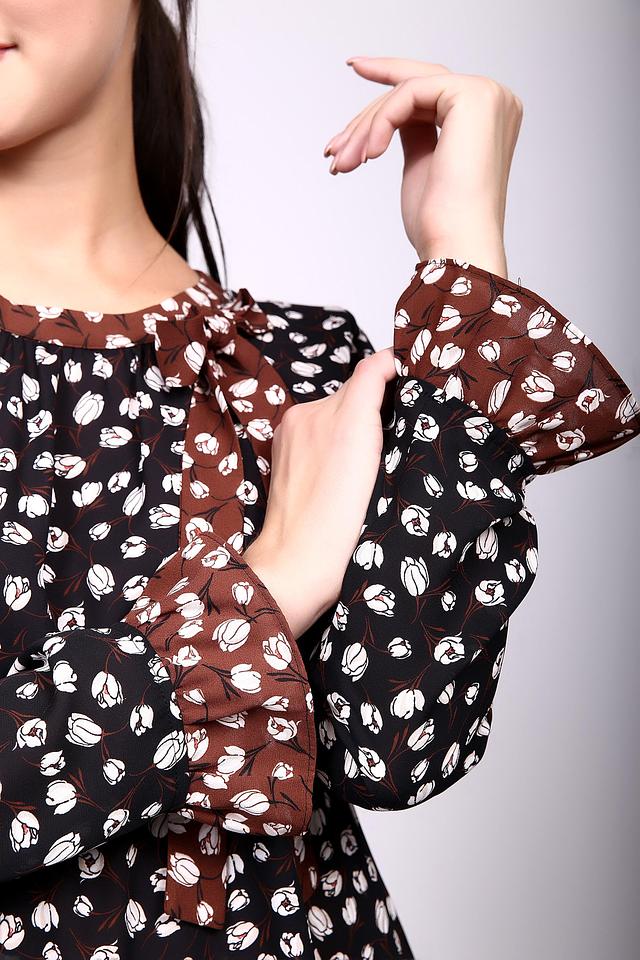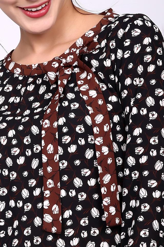 Блуза имеет оригинальный принт с цветочными мотивами в чёрно-коричневой гамме. Вырез горловины оформлен небольшим воротником-стойкой и завязками, которые добавляют образу изысканности.