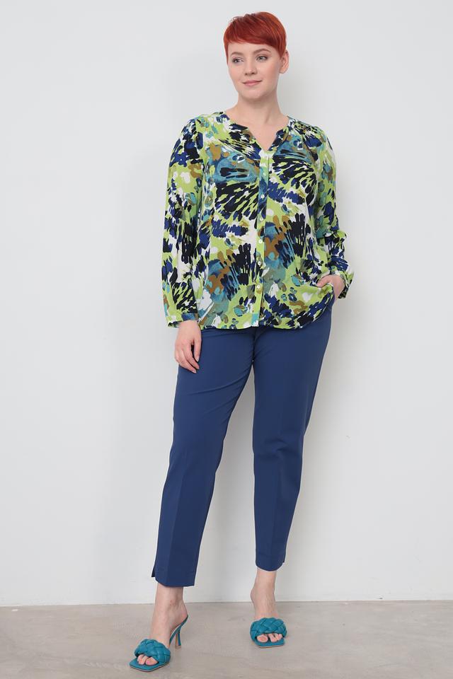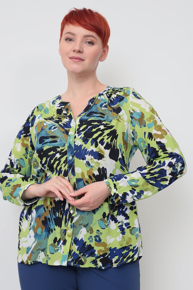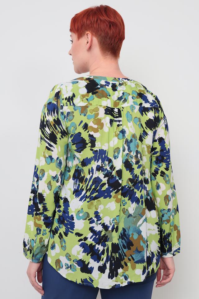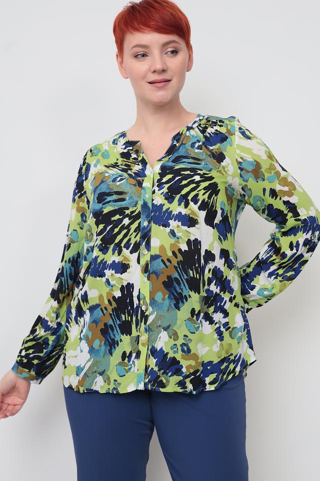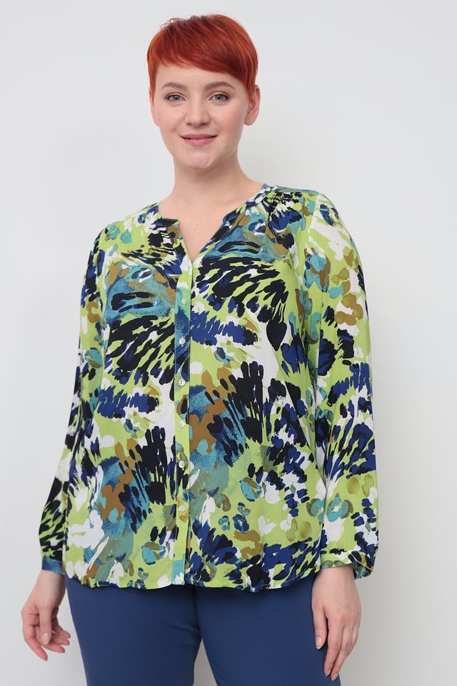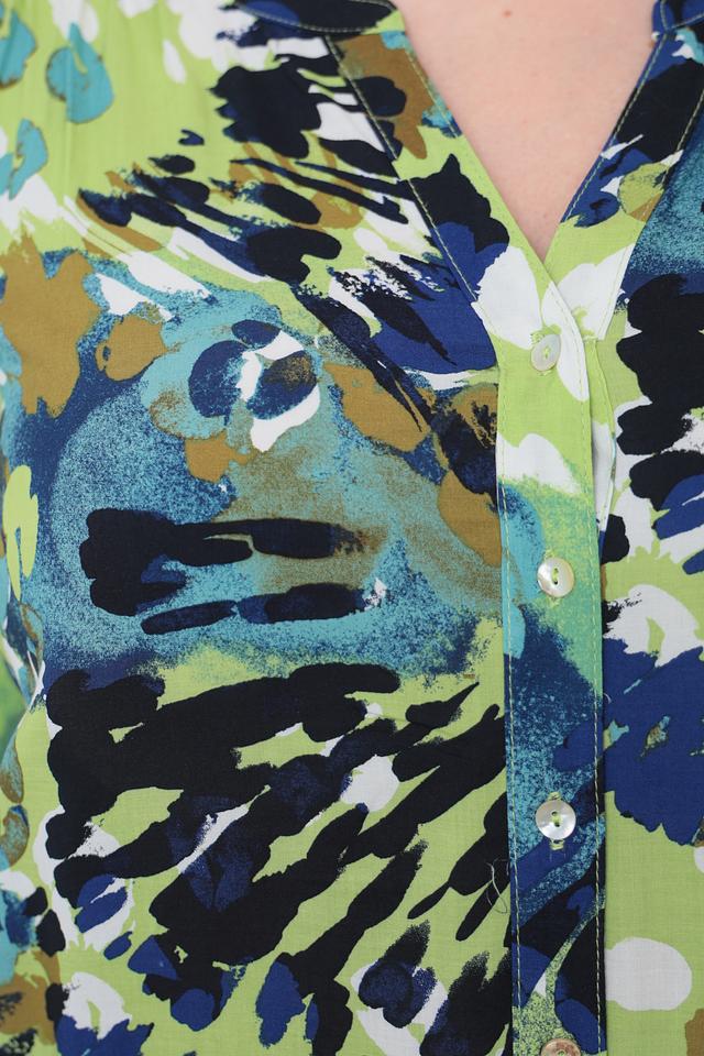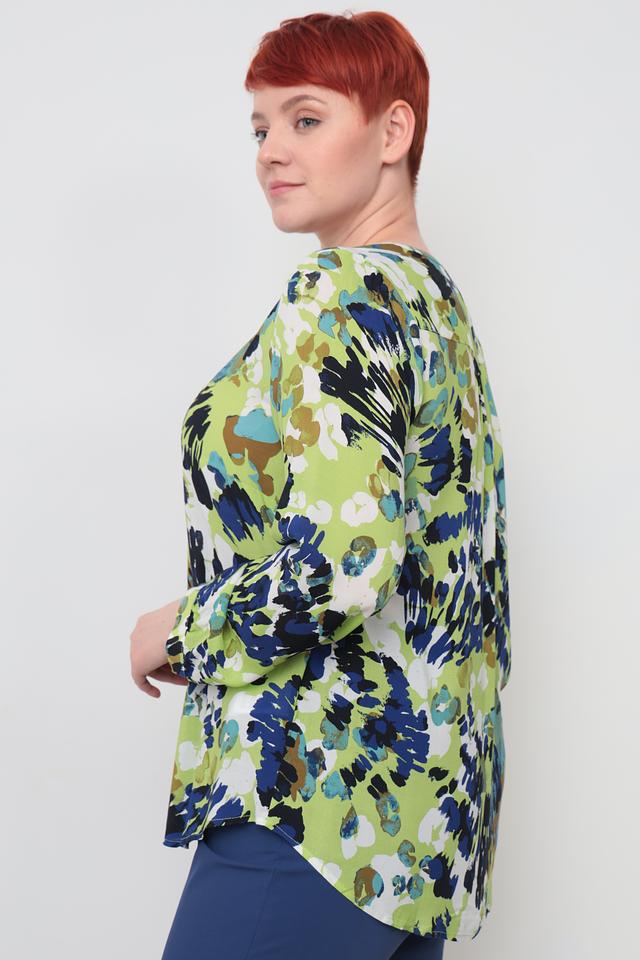 Блуза имеет оригинальный принт, сочетающий в себе оттенки зеленого, синего и коричневого. V-образный вырез горловины и ¾ рукава придают модели женственность и элегантность.
