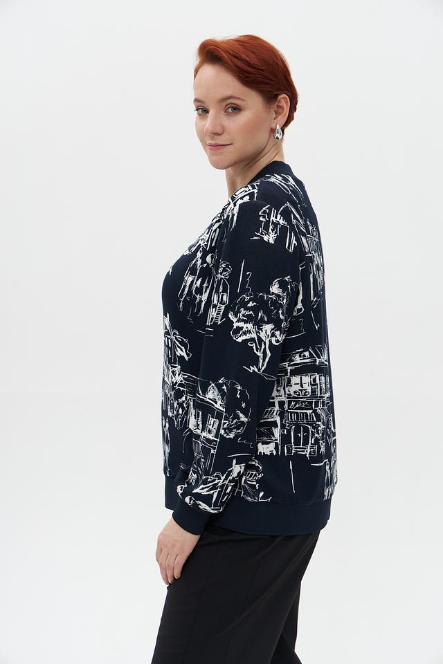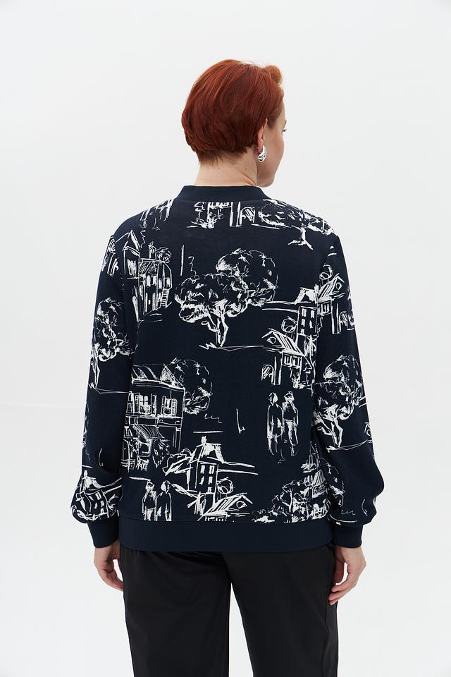 Этот жакет от Frapp станет ярким акцентом вашего гардероба. Выполненный в темно-синем цвете, он украшен необычным принтом с изображением архитектурных элементов и фигур людей, выполненным в белоснежном цвете.