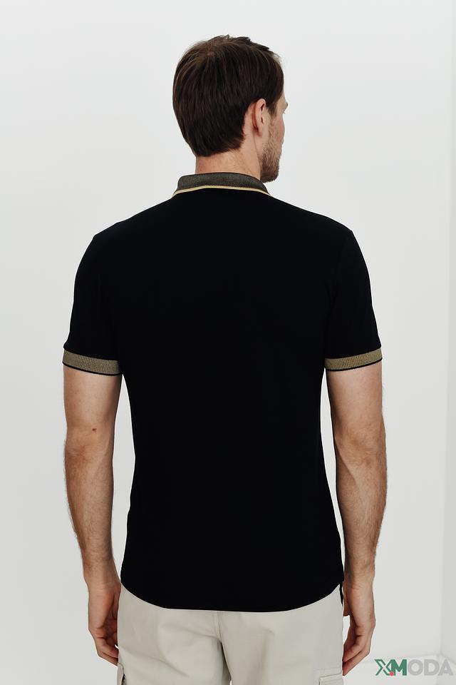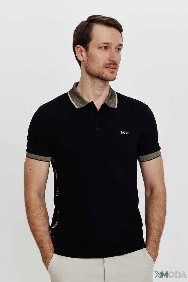 Мужское поло от бренда Boss Athleisure выполнено в классическом чёрном цвете. Модель отличается лаконичным дизайном и стильной отделкой золотистого цвета на воротнике и манжетах рукавов.
