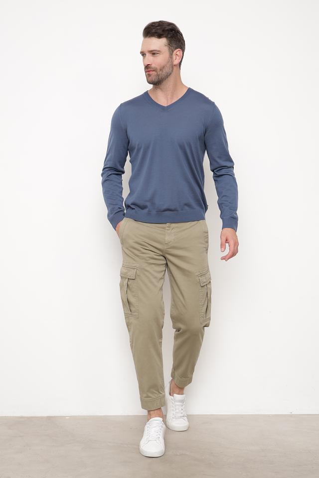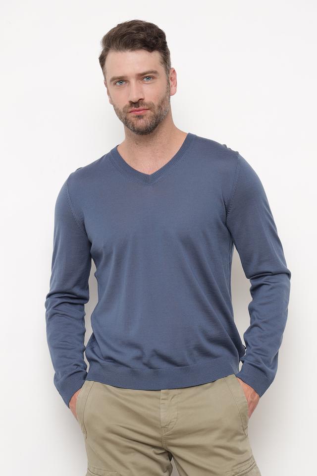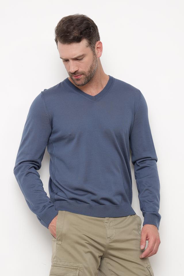 Джемпер имеет классический крой с V-образным вырезом, который подчеркивает мужественность и добавляет изысканности. Синий цвет делает его универсальным и легко сочетаемым с различными элементами гардероба.