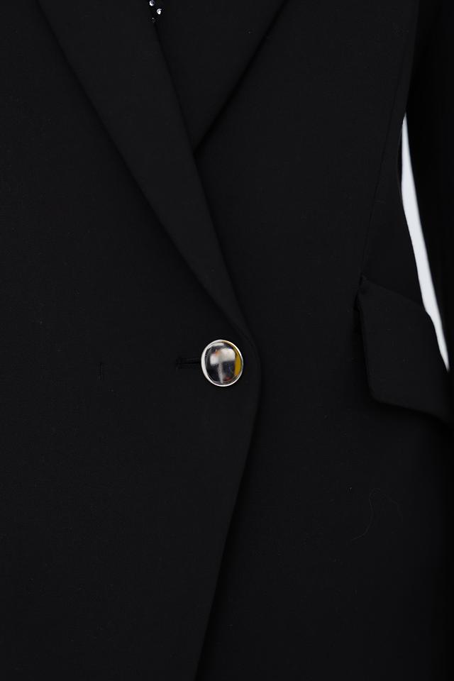 Жакет имеет однобортную застёжку на одну пуговицу, что придает ему элегантный вид. Прямой силуэт обеспечивает комфортную посадку по фигуре. Материал верха – смесь полиэстера, вискозы, хлопка и эластана, что гарантирует приятные тактильные ощущения и хорошую износостойкость.