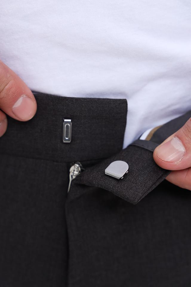Пиджак имеет однобортную застёжку на две пуговицы, стандартные лацканы, два боковых кармана с клапанами и внутренний карман. Брюки классического кроя, зауженные к низу, с молнией и пуговицей. Костюм выполнен из высококачественной шерсти с добавлением эластана, что обеспечивает комфорт и хорошую посадку по фигуре.