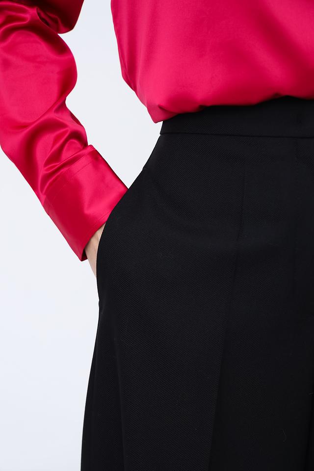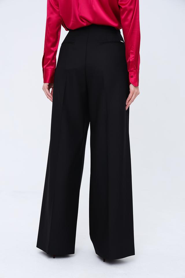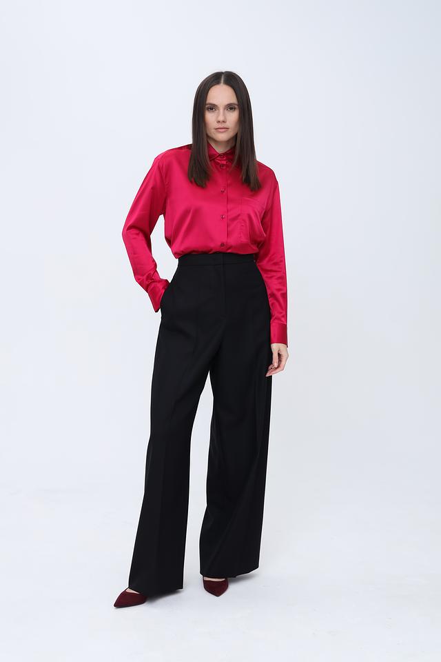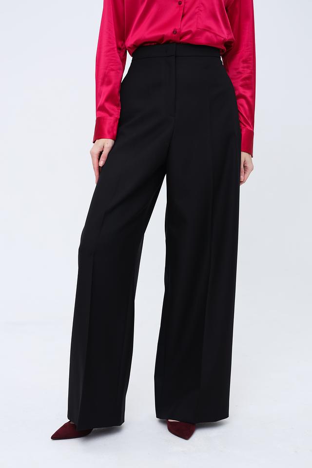 Брюки имеют прямой, широкий крой, который визуально удлиняет ноги и создает элегантный силуэт. Высокая посадка подчеркивает талию и обеспечивает комфортную посадку.