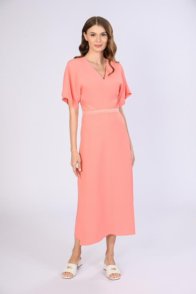 Платье Boss Black персикового цвета – элегантная модель длиной миди с V-образным вырезом и короткими рукавами. Платье выполнено из качественного ацетата и вискозы, имеет декоративную сборку на талии, подчеркивающую фигуру. Состав: ацетат 72%, вискоза 28%