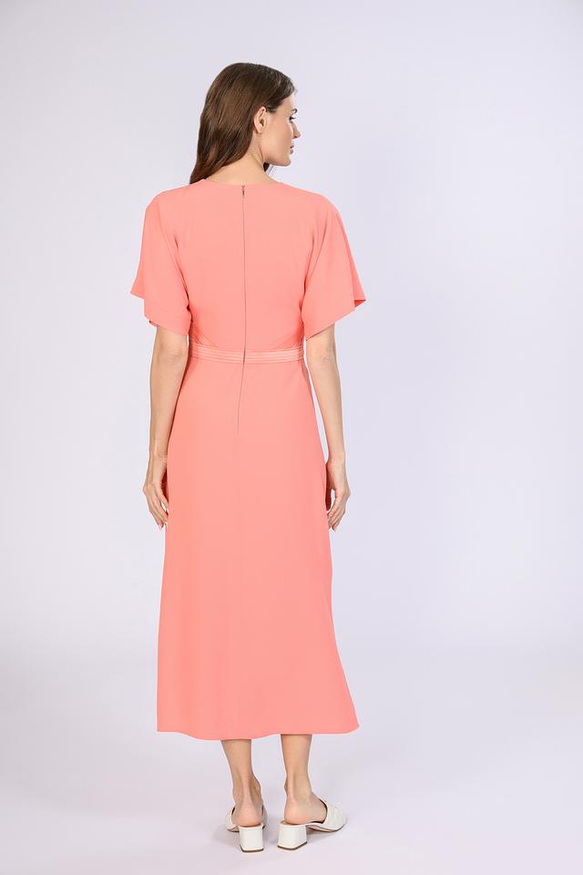 Платье имеет длину миди, V-образный вырез и короткие рукава, что придает ему женственность и элегантность. Декоративная сборка на талии визуально подчеркивает силуэт и создает более изящный образ.