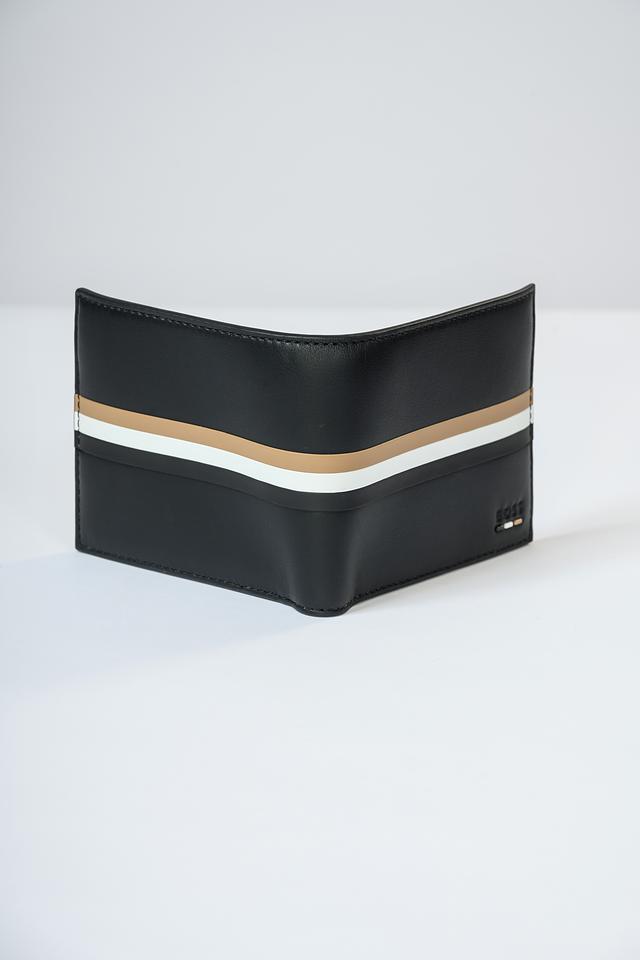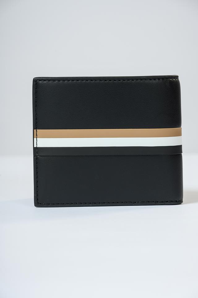 Мужской кошелек от Boss Black выполнен в строгом чёрном цвете и дополнен стильными полосами бежевого и белого оттенков. Кошелек имеет классическую прямоугольную форму и компактный размер, что обеспечивает удобство при ношении.