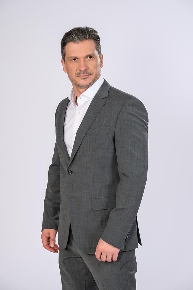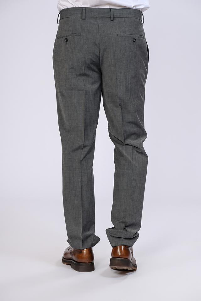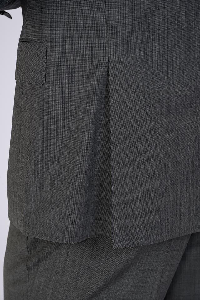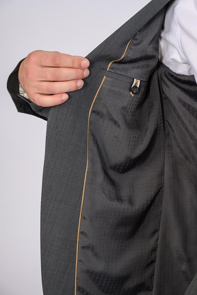Пиджак имеет однобортную застежку на две пуговицы, лацканы стандартной ширины и функциональные карманы с клапанами. Брюки классического кроя с застежкой на молнию и пуговицу, обеспечивают комфортную посадку и свободу движений.