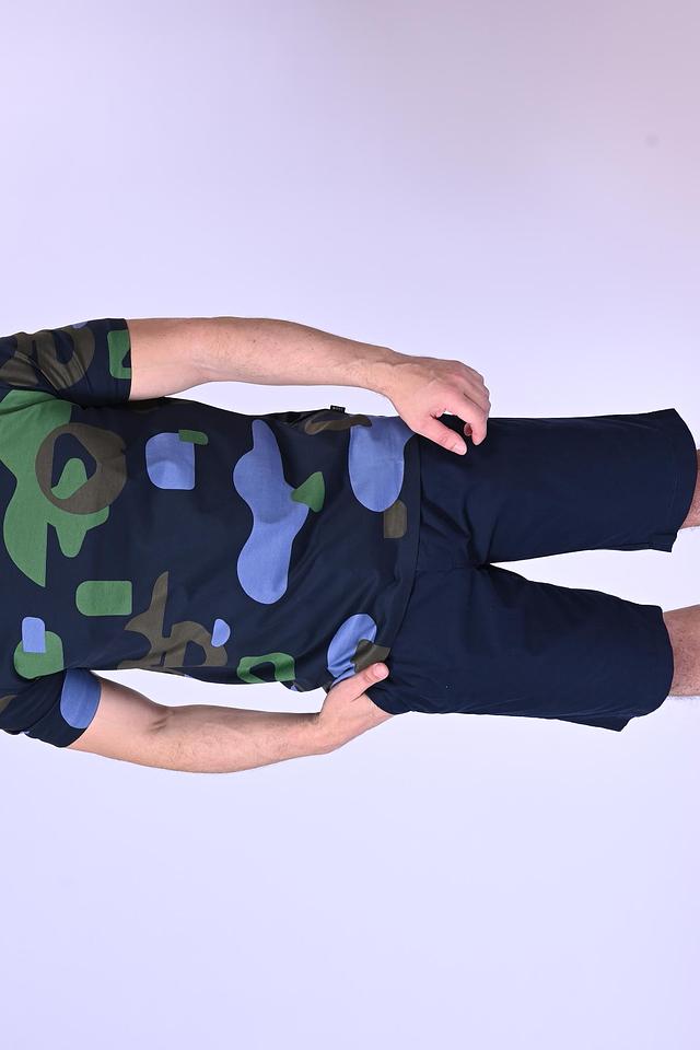 Особенностью данной модели является яркий камуфляжный принт, выполненный в сочетании синего, зеленого и коричневого оттенков. Этот рисунок добавляет образу динамичности и индивидуальности.