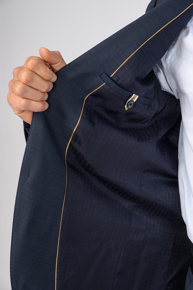 Костюм состоит из пиджака и брюк. Пиджак имеет классический крой, однобортную застёжку на две пуговицы и стандартные лацканы. Брюки имеют прямой крой и стандартную посадку. Ткань костюма имеет мелкий, едва заметный рисунок, придающий ему текстуру и изысканность. Подкладка пиджака выполнена в контрастном бежевом цвете.