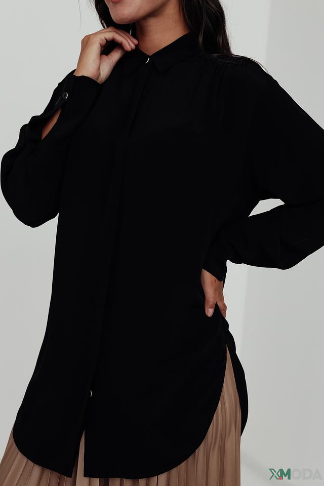 Блуза имеет прямой крой, длинные рукава с манжетами и воротник. Застёжка выполнена на пуговицы. Спинка блузы имеет небольшую складку, придающую ей более изысканный вид.